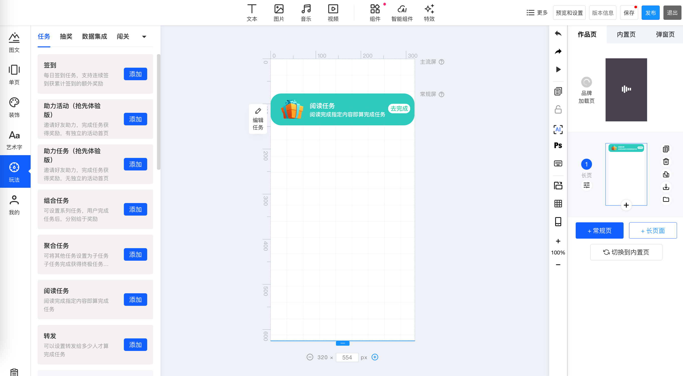 ①通过空白创建打开H5编辑器→②添加任务玩法(根据需求选择需要的系统任务或者自定义任务)→③配置任务内容→④保存发布