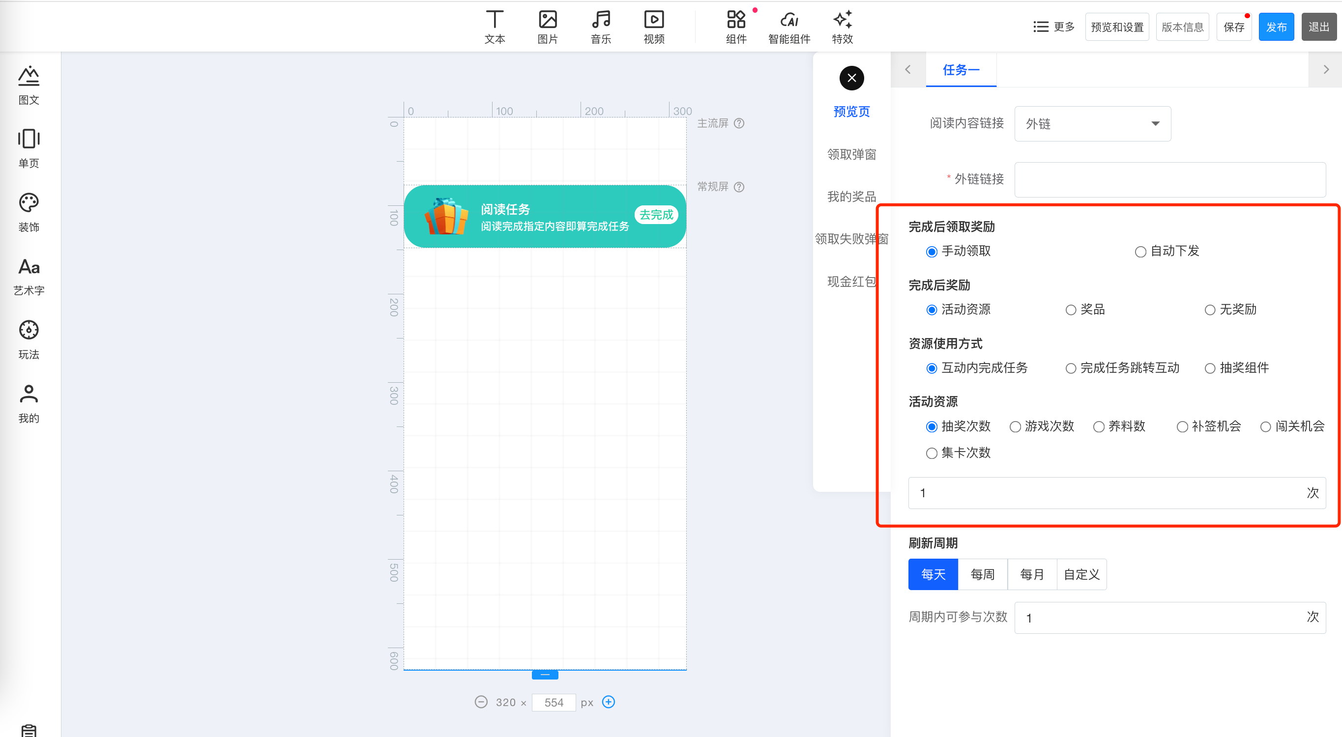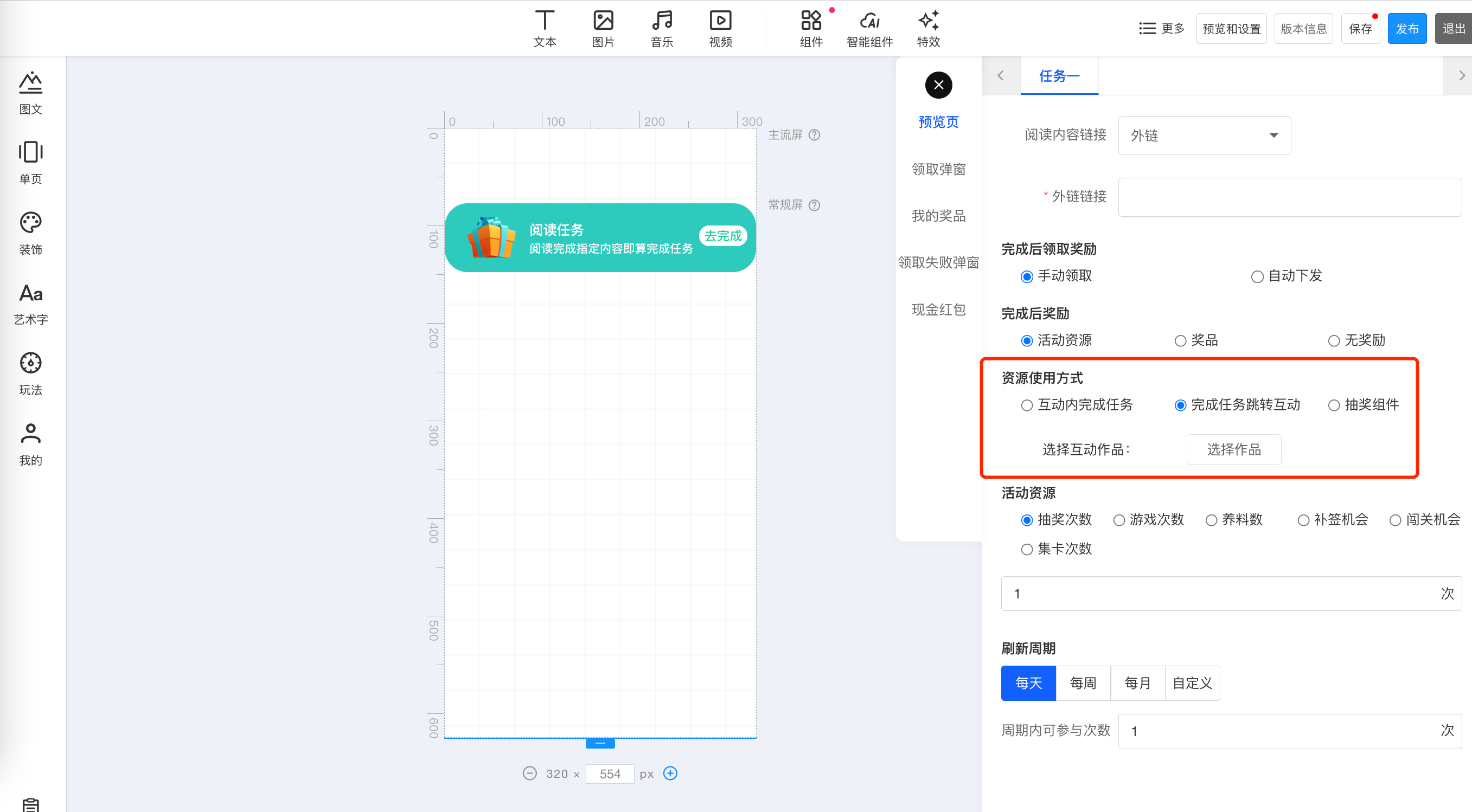 更适配,我们对任务组件做了优化,包括任务组件新增可主动关联互动作品、H5抽奖组件;完成任务获得奖励中新增集卡次数,即互动集卡活动可以设置完成任务获得