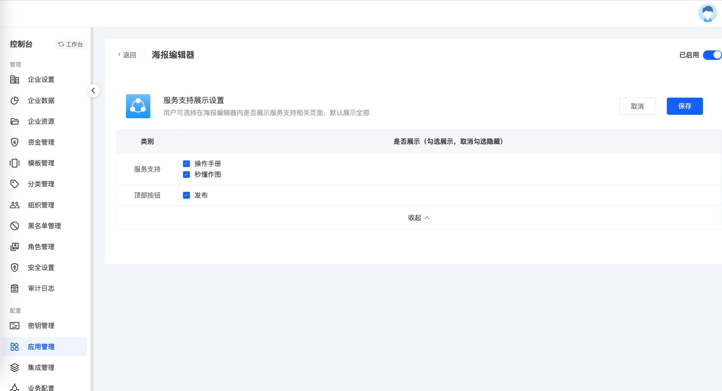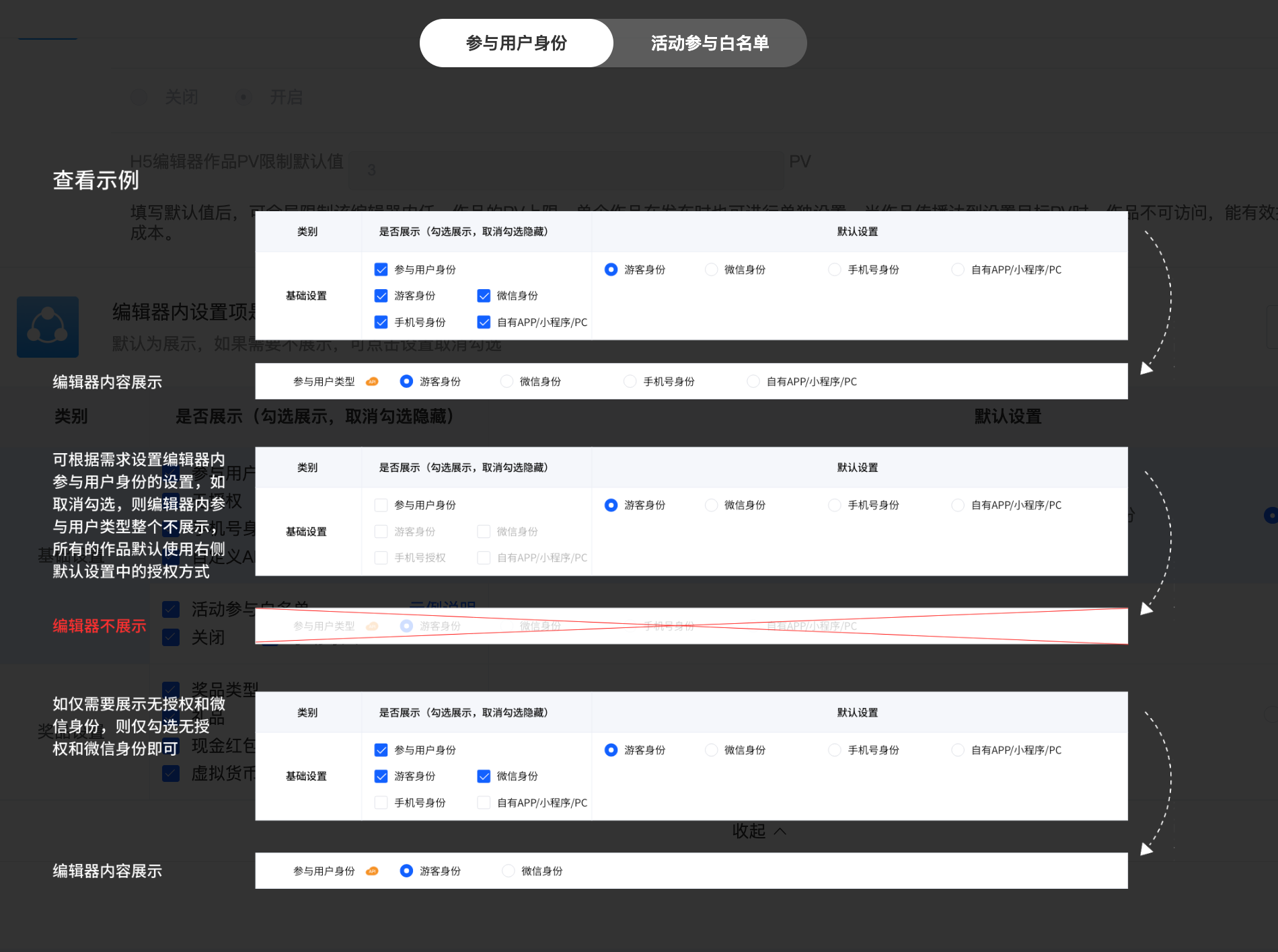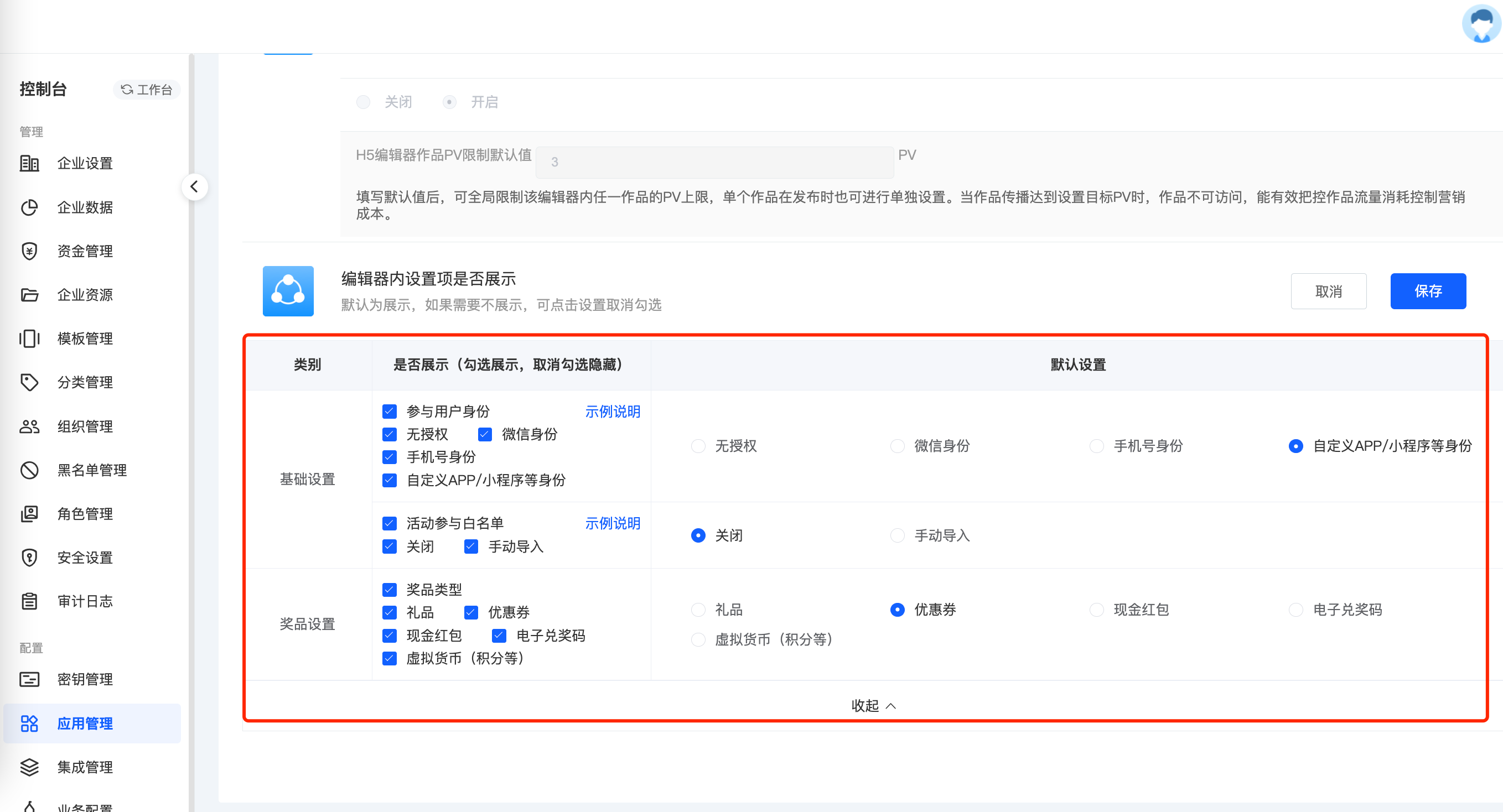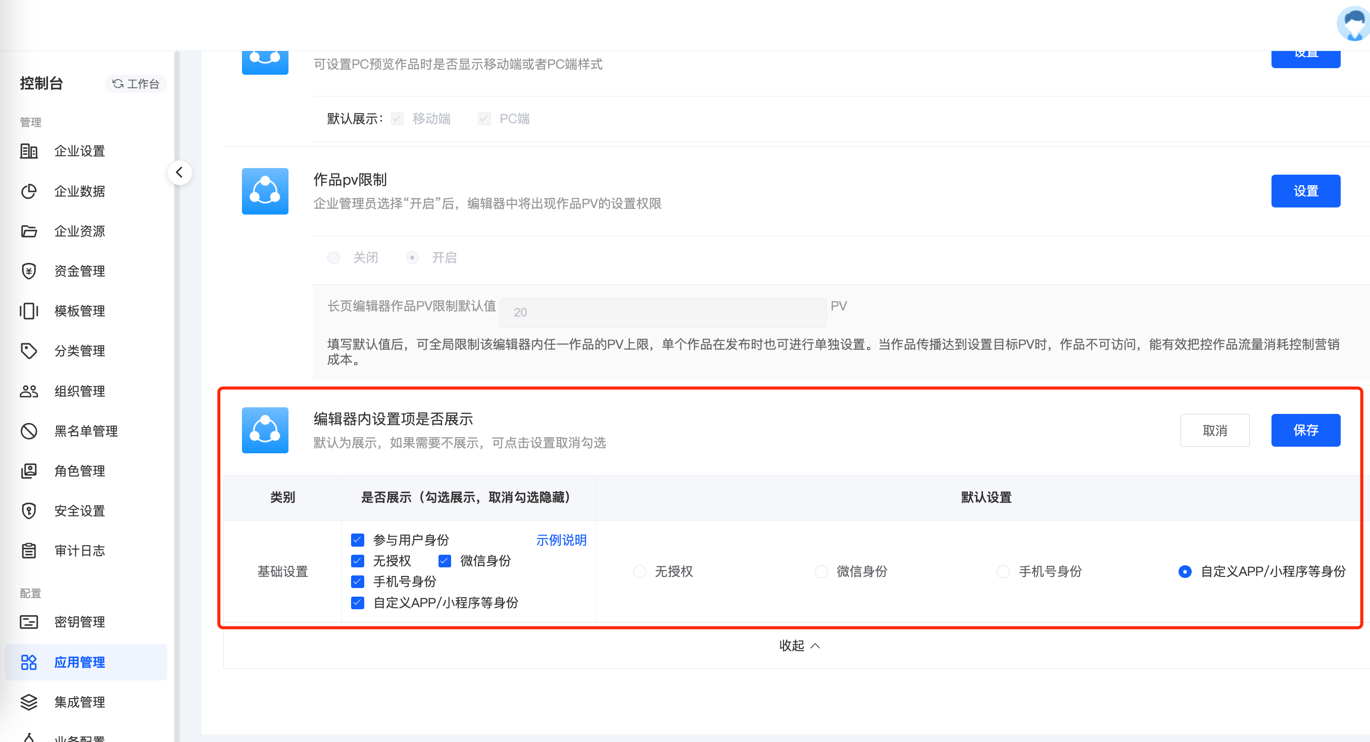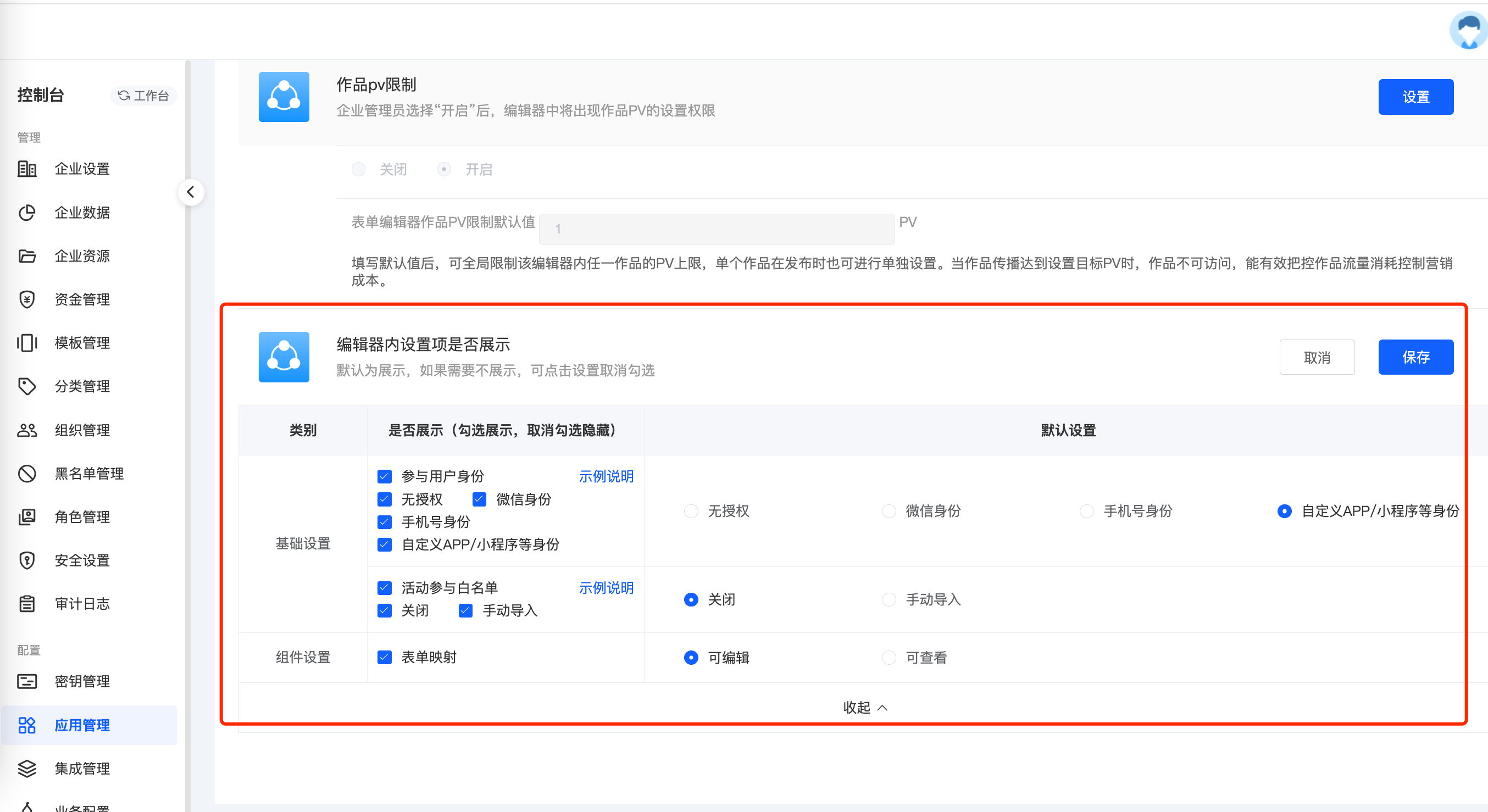 ①应用管理-H5编辑器/互动编辑器/表单编辑器/长页编辑器/海报编辑器/创意小工具→②编辑器内设置项是否展示→③设置→④各编辑器内隐藏生效