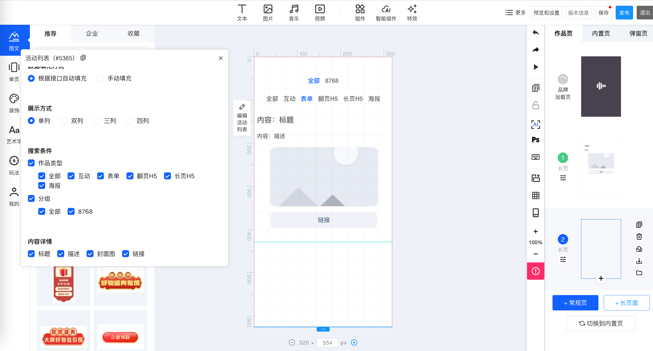 ①集成管理-数据集成中配置动态内容接口→②通过空白创建打开H5编辑器→③添加活动列表组件→④设置活动列表组件→⑤保存发布