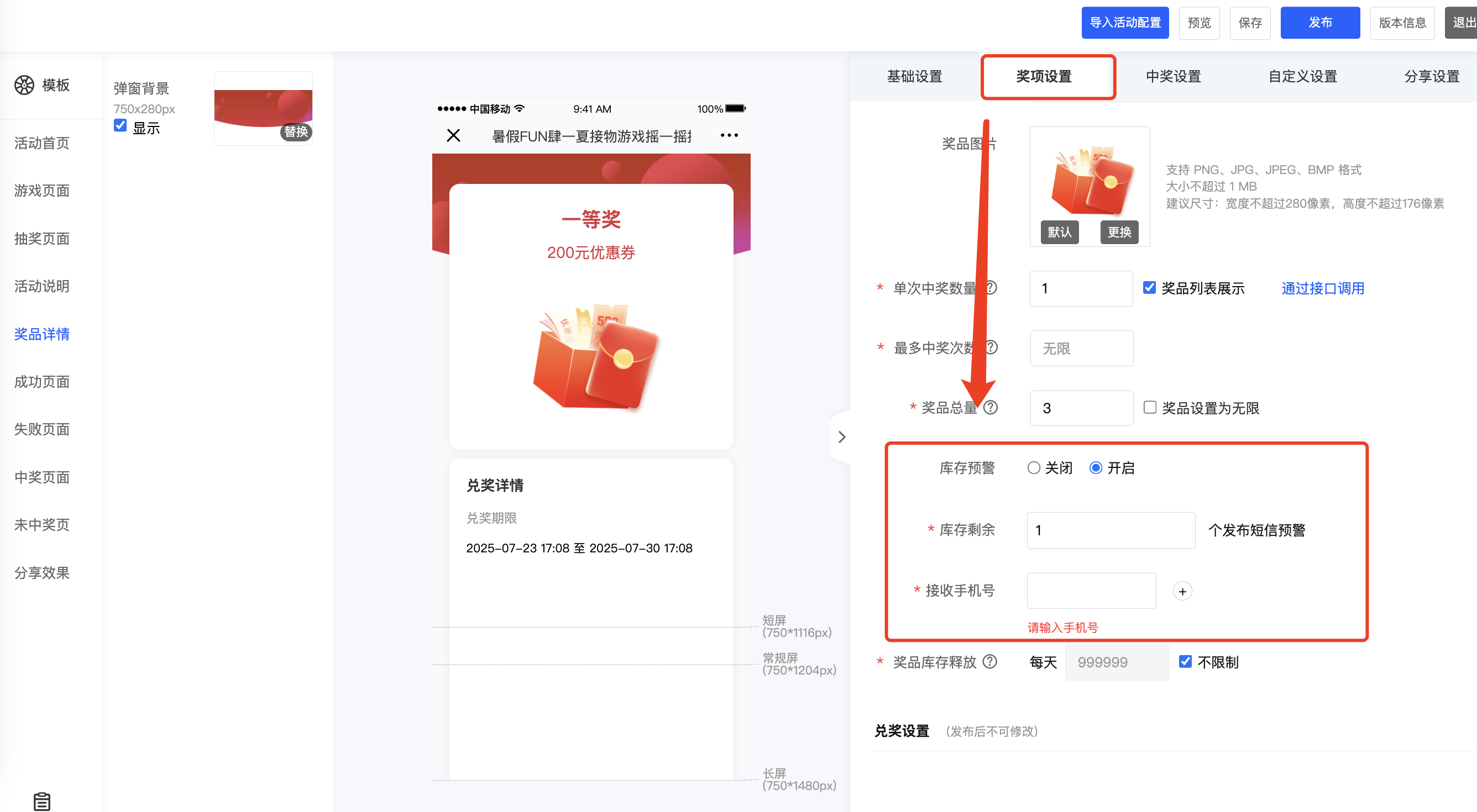互动抽奖、游戏抽奖、游戏排名类型的活动中,在设置奖品时,新增奖品短信预警功能,主办方可以设置奖品还剩多少时收到短信预警;