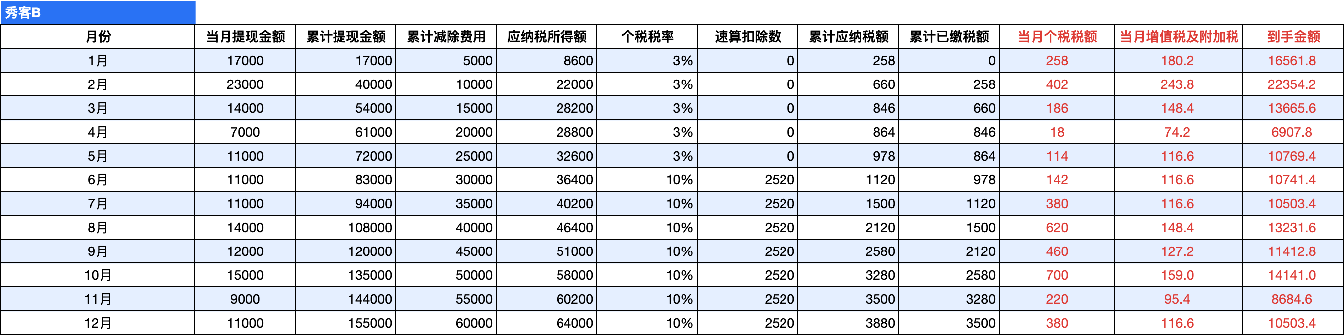 即:9月提现,10月打款,届时将扣除个税、增值税及附加税;11月申报个税后税务系统返回信息;12月申报增值税及附加税,若无需缴纳,将在申报后返还预扣的增值税及附加税至秀客提现银行卡账户。