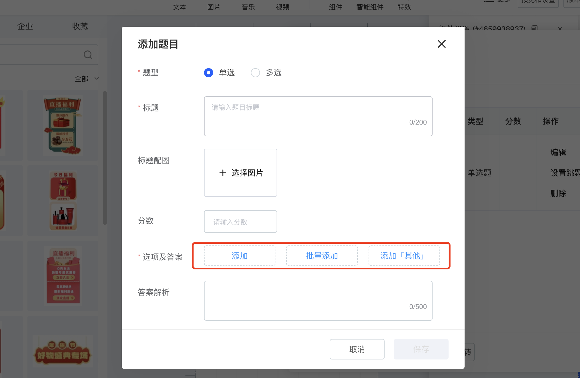 添加题目时,支持添加单个选项,支持批量添加,支持添加其他选项