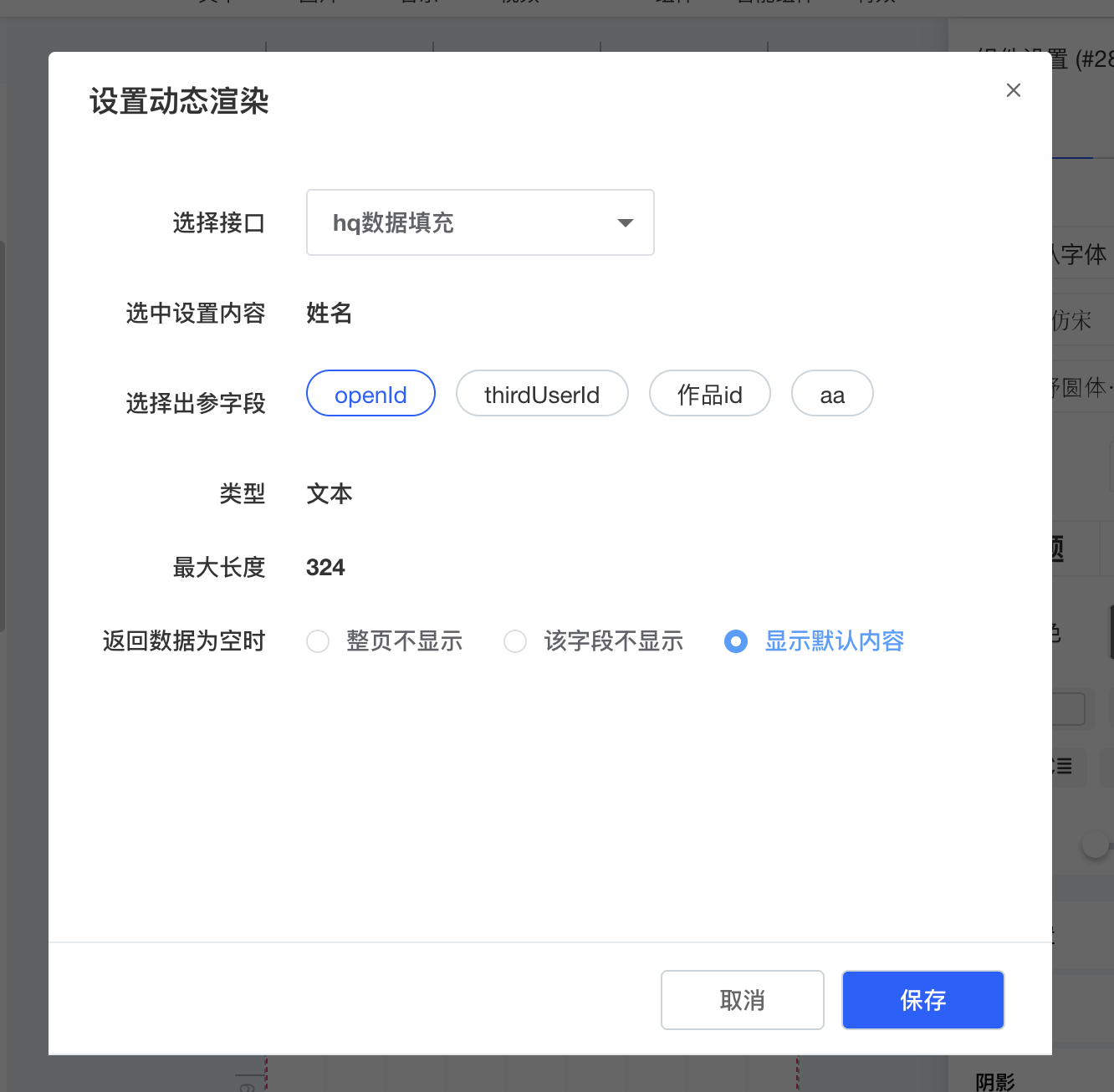 ④.会弹出设置动态渲染的弹框,选择该字段使用的数据来源接口,选择之后,可以看到该接口相关的「出参字段」,选中即可。