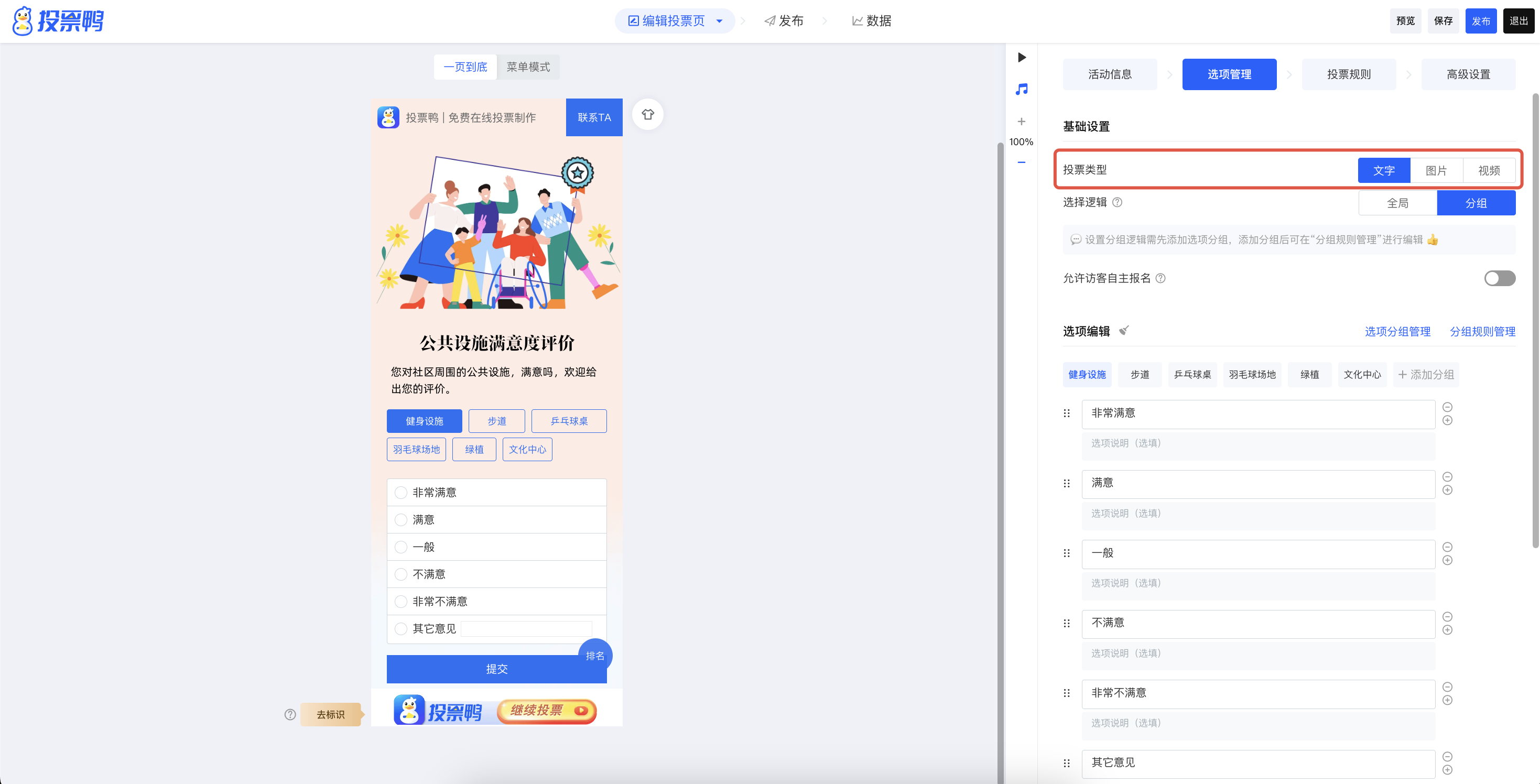 选择任意喜欢的模板,进入编辑器,常规修改标题、介绍、投票日期后,将投票类型选择到“文字”。