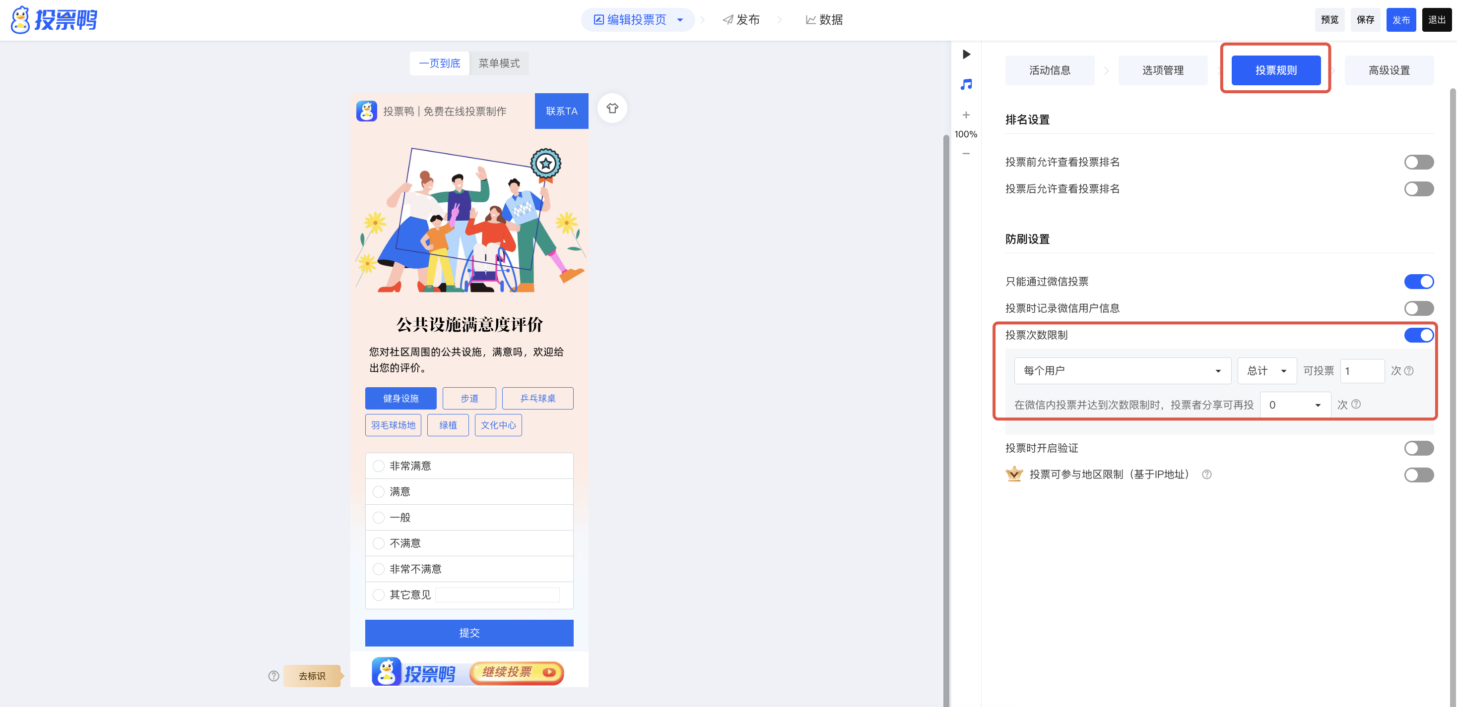4.2、设置总共只能投一次票,让参与者只能进行一次评价。