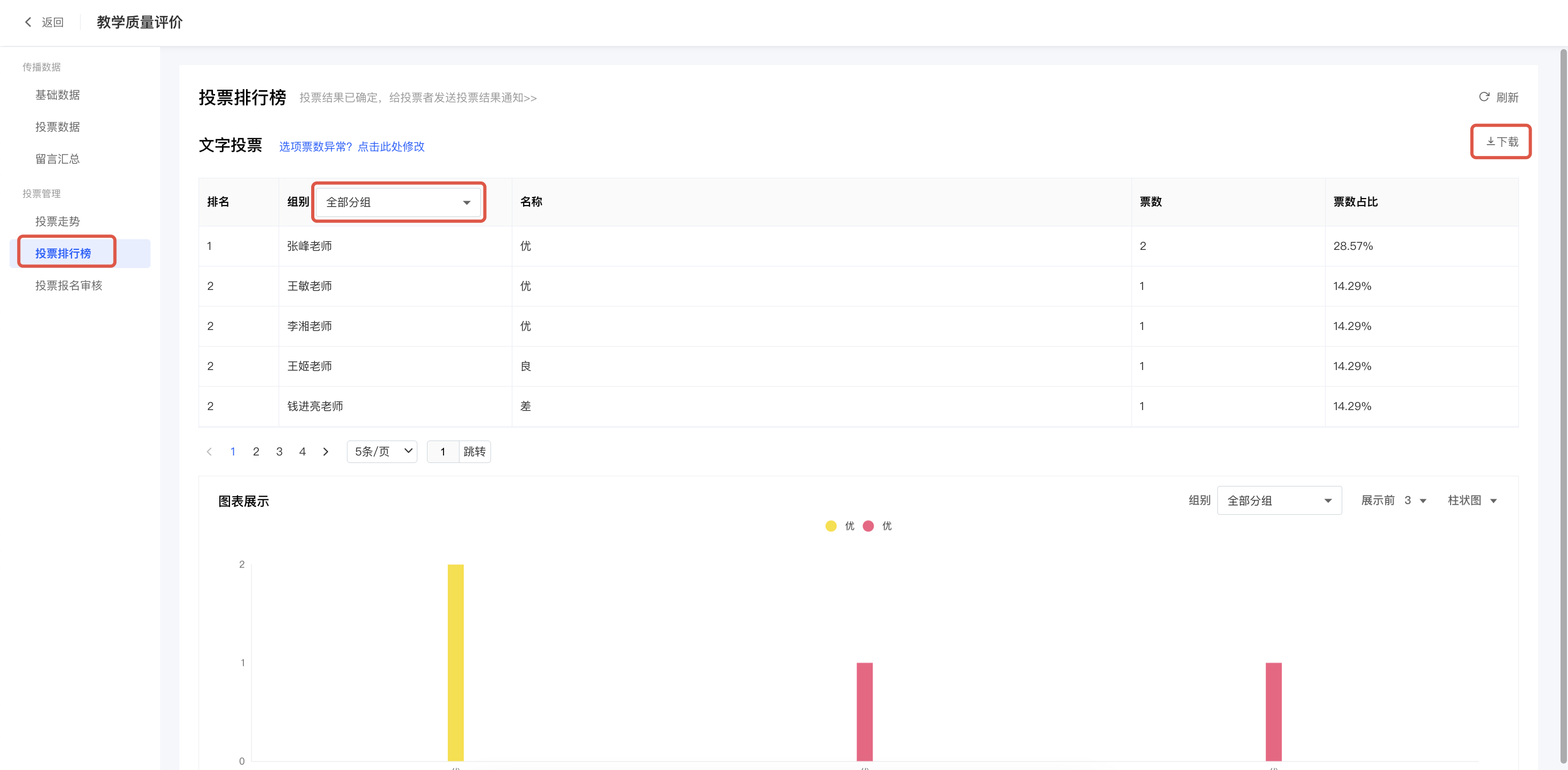 进入作品的“数据”,点到“投票排行榜”,组别选择“全部分组”,将数据以excel表格形式下载到本地,通过简单数据整理,即可汇总出各个对象的评价情况。