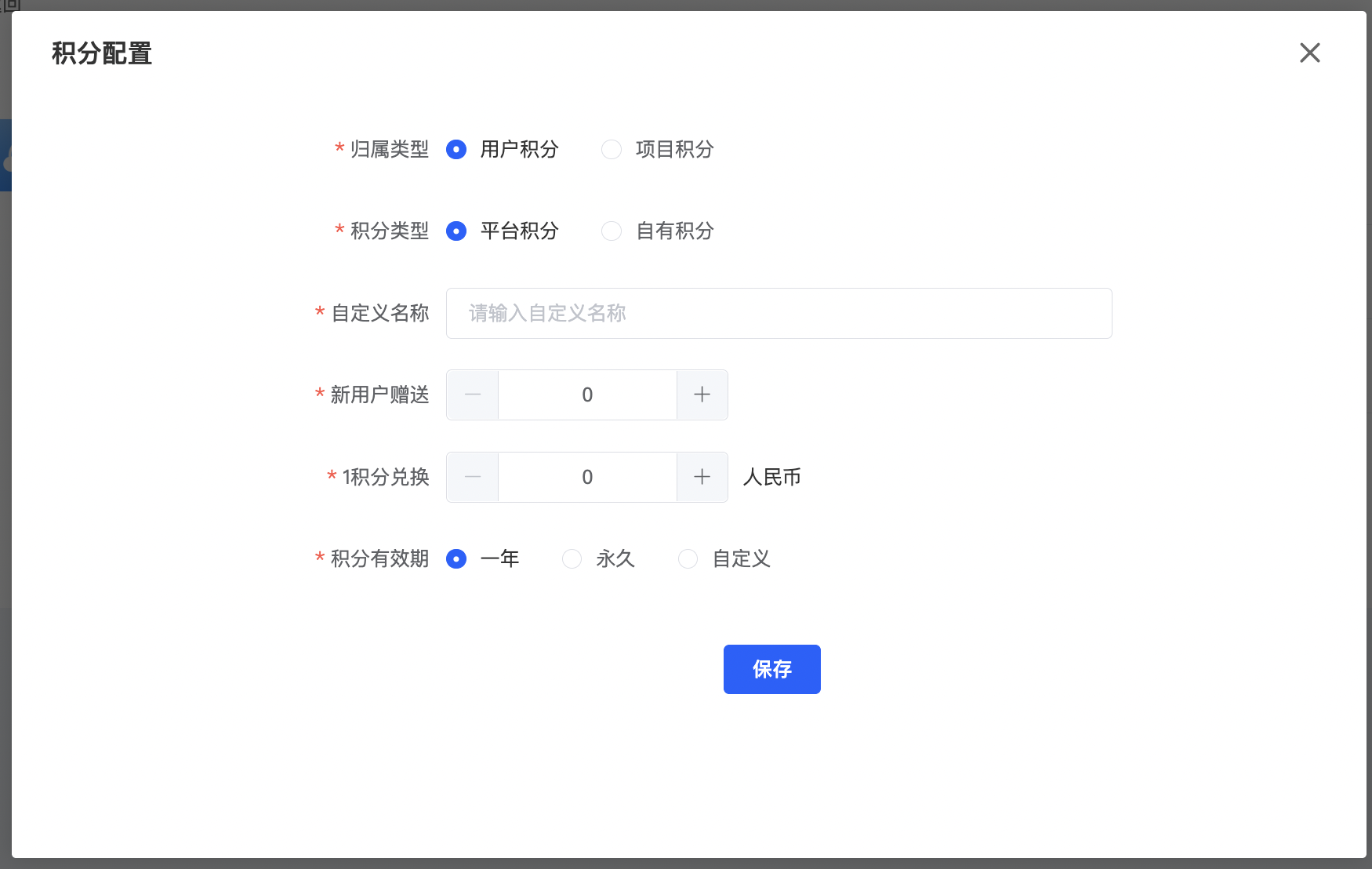 如果客户没有自己的积分系统,那就选择默认的平台积分,自定义名称和有效期即可;