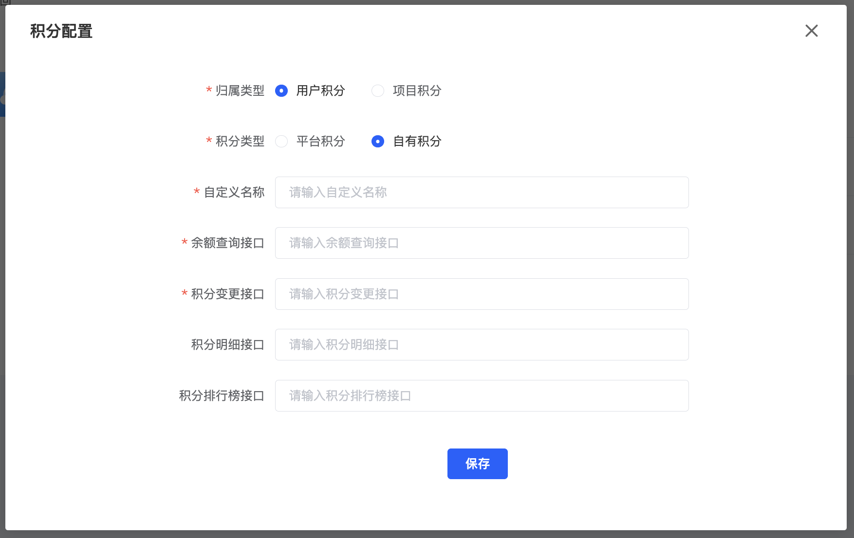 如果客户有自己的积分系统,则点击自有积分,配置积分相关的接口;