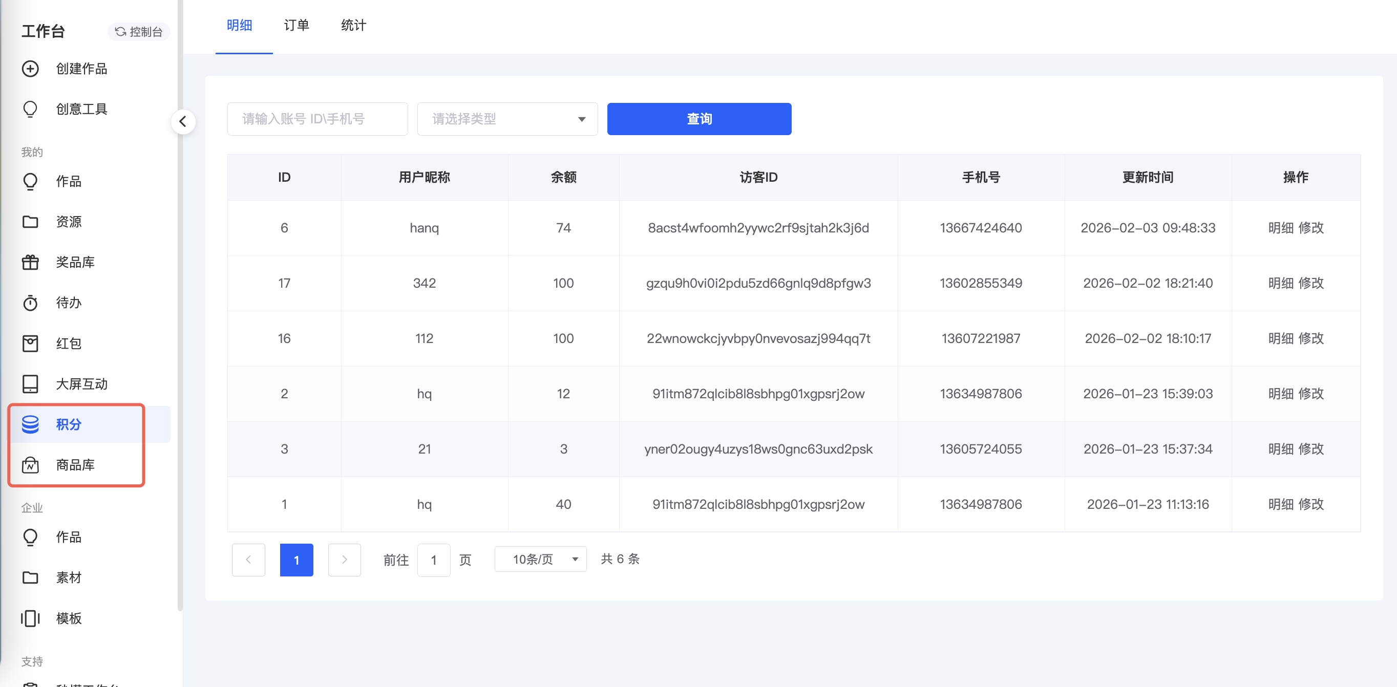 配置之后,在工作台”我的“下方就会出现积分和商品库的菜单,在积分中,可以查看访客的积分明细,支持给访客增加或者扣除积分