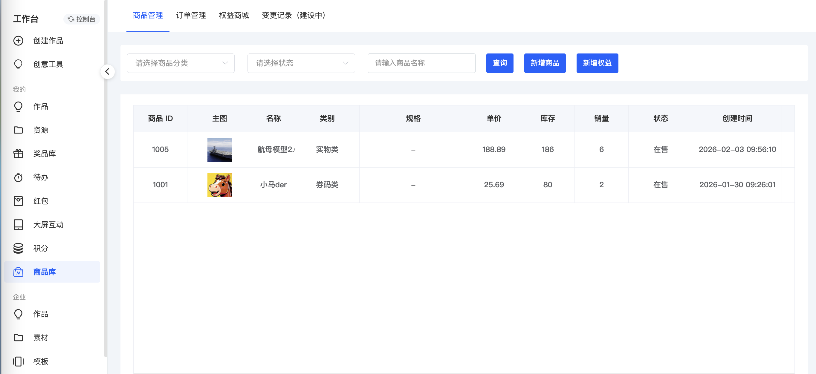点击商品库,添加商品,或者添加活动权益;