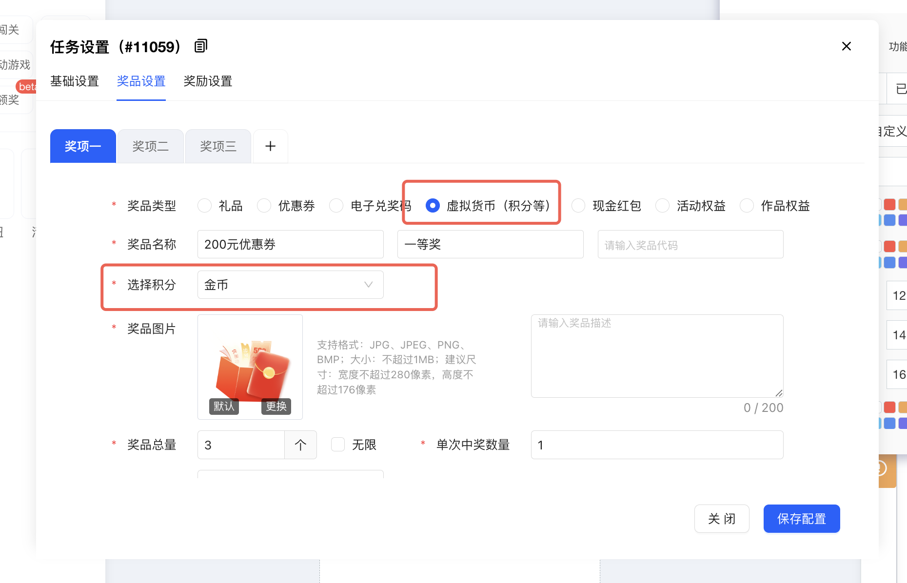 在任务配置-奖品设置中,选择积分,设置该任务奖励1个积分,在中奖数量中输入1