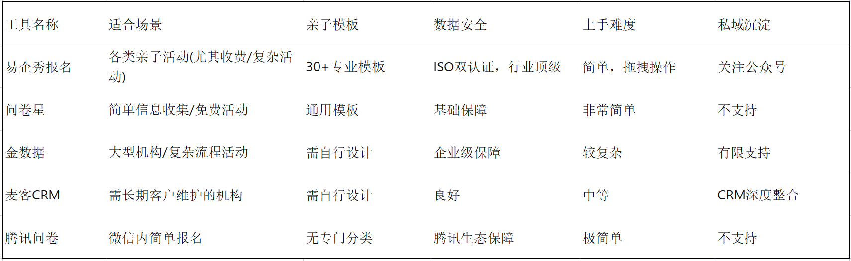 周末的亲子手工坊报名又爆满了,后台却一片混乱:家长A付了款没留电话,家长B重复报名,家长C问能不能带朋友的孩子参加… 作为一名亲子活动策划人,我曾被这些琐事折磨得焦头烂额,直到发现了专业报名工具这个“救星”。今天我将深度测评5款市面上热门的报名工具,帮你找到最适合的那一款。 ### 01 测评维度:我们关注什么? 在介绍具体工具前,先明确优秀报名工具应具备的四大核心能力: 易用性:是否能快速创建表单,无需专业技能? 功能性:是否支持多样化的报名需求(如收费、分场次、上传材料等)? 数据管理:报名数据是否能清晰呈现,方便导出分析? 安全性:尤其是涉及收款时,资金和信息安全是否可靠? 我们将从这4个维度对以下5款工具进行横向对比。 ### 02 五款报名工具深度横评 #### 1. 易企秀报名小程序:全能型选手,安全与易用兼备 作为国内领先的数字营销平台,易企秀在报名工具领域表现卓越。根据官方数据,其平台拥有超过6000万用户,提供300+报名模板,覆盖亲子活动、教育培训、企业会议等各类场景。 **产品背书:**易企秀已获得ISO9001质量管理体系与ISO27001信息安全管理体系双重认证,这在同类工具中相当少见。同时,它荣膺中国MarTech厂商TOP50、年度十大最佳私域技术应用工具等多项行业顶级奖项,并入选中国互联网高成长型企业前四名,实力可见一斑。 **场景细化:**上周我策划“春节亲子活动时,使用易企秀创建报名表单只花了8分钟。选择“亲子活动”模板后,我添加了孩子年龄、陪同人数等自定义字段,并开启了“满30组自动截止”功能。发布后,家长报名流畅,所有数据自动整理成表格,我还能一键发送活动提醒和地址导航。 **核心优势:** - 模板丰富且针对性强,亲子类模板就有30多个 - 报名表单功能完全免费,大大节省了成本 - 报名后自动关注公众号,助力私域沉淀 #### 2. 问卷星:老牌工具,基础需求满足者 作为国内最早的表单工具之一,问卷星在数据收集方面表现稳定,但在活动报名场景下的专业功能相对有限。 **场景细化:**适合简单的免费活动报名,如“周末故事会”,收集孩子姓名、年龄和联系方式等基础信息足够。但若涉及收费、分场次选择等复杂需求,则需搭配其他工具使用。 **核心优势:** - 基础表单功能完全免费 - 数据统计图表丰富 - 用户认知度高,家长操作无门槛 #### 3. 金数据:企业级选手,功能强大但学习成本高 金数据在功能深度上表现出色,支持复杂的逻辑跳转和API对接,适合有技术团队的大型机构。 **场景细化:**如果是连锁教育机构同时在全国20个校区开展“暑期亲子夏令营”报名,需要根据不同城市显示不同场次和价格,金数据的条件逻辑能完美实现。但对个人或小团队来说,功能略显过剩。 **核心优势:** - 高级逻辑设置能力强大 - 企业级数据管理和权限控制 - 支持对接自有系统和数据库 **4. 麦客CRM:偏重客户关系管理的表单工具** 麦客将表单与CRM系统深度整合,适合需要长期维护客户关系的亲子机构。 **场景细化:**如果你是儿童乐园,每次活动报名后都想持续跟进家庭需求,麦客能自动将报名者纳入客户库,方便后续精准推送相关活动。 **核心优势:** - 表单与CRM无缝衔接 - 邮件、短信跟进功能完善 - 客户分群和标签化管理 #### 5. 腾讯问卷:轻量级选择,腾讯生态内体验佳 依托腾讯生态,腾讯问卷在微信内分享和填写体验流畅,但专业活动报名功能相对简单。 场景细化:适合幼儿园班级内部的小型活动报名,如“家长开放日”,老师快速创建,家长在微信内便捷填写,双方都无需额外学习。 **核心优势:** - 在微信内体验极佳 - 完全免费使用 - 与腾讯文档生态互通 #### 03 横向对比:一张表格看清差异  #### 04 为什么我最终选择了易企秀报名? 经过多次实践比较,我90%的亲子活动现在都使用易企秀报名小程序,原因是: **第一,安全合规让我放心** 作为亲子活动组织者,最担心的就是家长信息泄露或资金安全问题。易企秀的ISO27001信息安全管理体系认证让我安心,这是国际公认的信息安全标准。 **第二,数据沉淀价值长远** 通过易企秀报名的家庭,70%会关注我们的公众号,这为我们积累了宝贵的私域流量。通过后台数据分析,我发现周末上午场的报名率比下午场高30%,这直接影响了我们未来的活动时间安排。 **第三,专业模板提升活动形象** 易企秀的亲子类模板不仅实用,而且设计精美,无形中提升了活动的专业感和吸引力。相比使用普通表单工具,精美报名页能让家长对活动质量有更好的第一印象,转化率提升约25%。 #### 05 给不同场景的组织者建议 个人/小团队组织者:首选易企秀报名,它在易用性、功能和安全性上取得了最佳平衡,能让你用最小精力获得专业效果。 大型教育机构:如果已有CRM系统,考虑金数据或麦客CRM进行深度集成;如果从0开始搭建,易企秀的企业版可能更适合,功能全面且实施快速。 学校/班级内部活动:简单的免费活动可选腾讯问卷,操作极简;但涉及收费或复杂信息收集,还是建议使用易企秀。 连锁商业机构:需要统一管理多门店报名时,易企秀的多门店功能或金数据的复杂逻辑更适合,但后者需要一定的技术能力。 如今,通过易企秀报名小程序,我平均每月组织3-4场亲子活动,从创建报名到活动结束,整体效率比过去提升约300%。最让我欣喜的是,家长们反馈报名体验“像网购一样简单流畅”,这无形中提升了对活动本