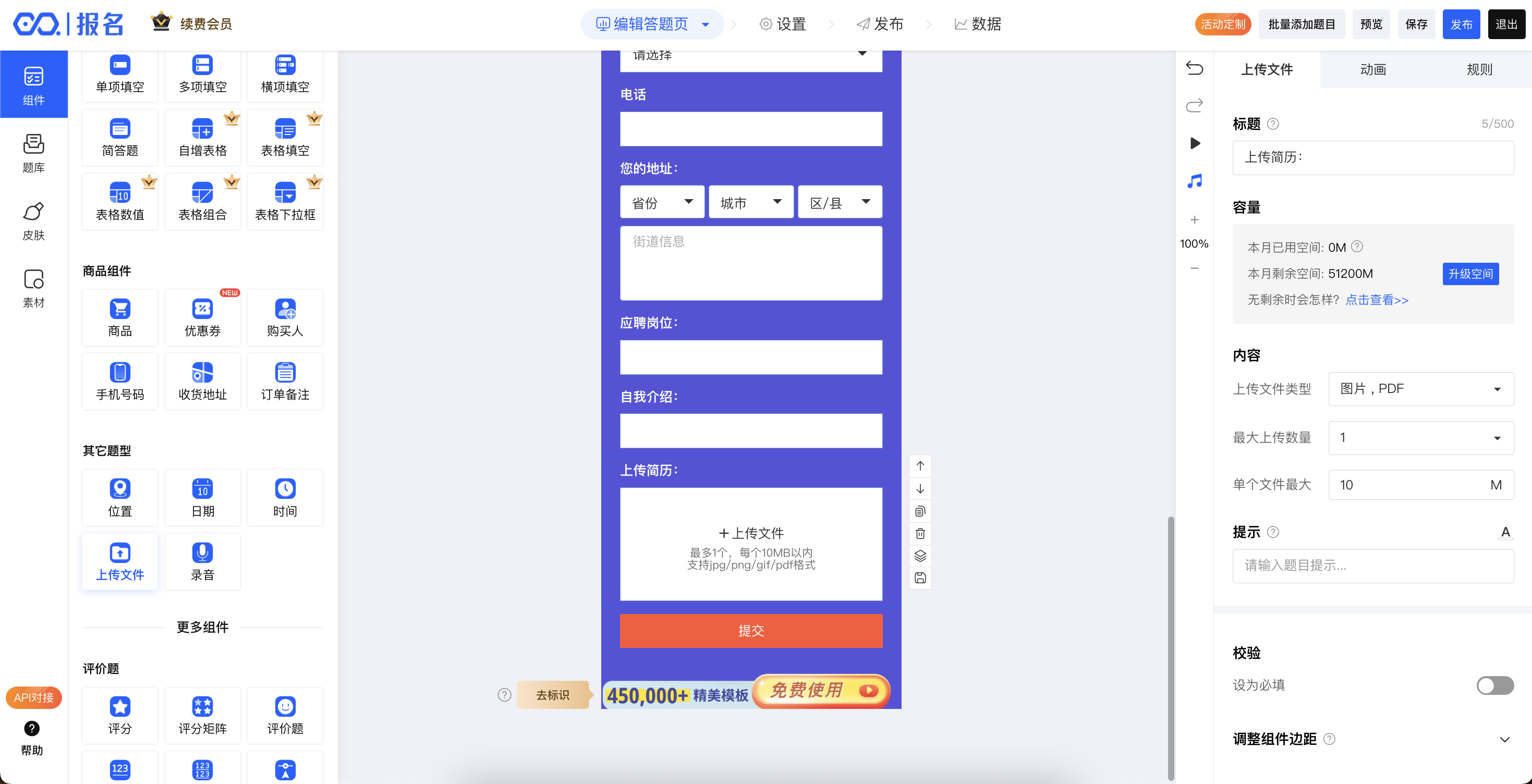 并在编辑器右侧设置上传文件的类型:图片/视频/Word/Excel/PPT/PDF,及可上传的文件数量,并且设置单个文件大小限制,即可实现让用户通过您的表单上传文件啦;