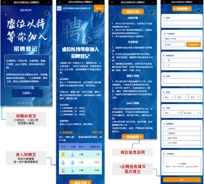 现在,通过易企秀表单,为大家提供了一种更高效的简历收集方式,既可以扩展你的招聘渠道,又让应聘者没有投递门槛,所见即可投,简历收集更加高效。