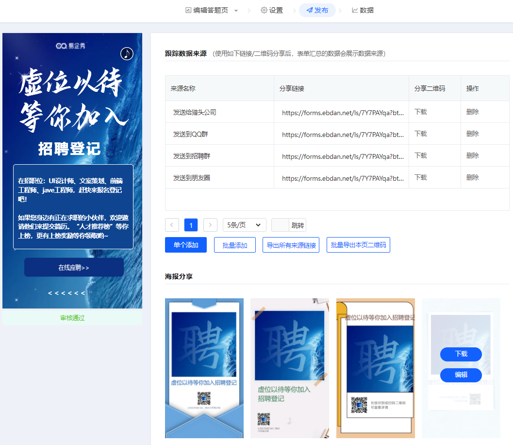 3、发布后,自动生成招聘海报,还可为每个招聘渠道生成一个招聘链接,来监控不同渠道回收简历的情况。