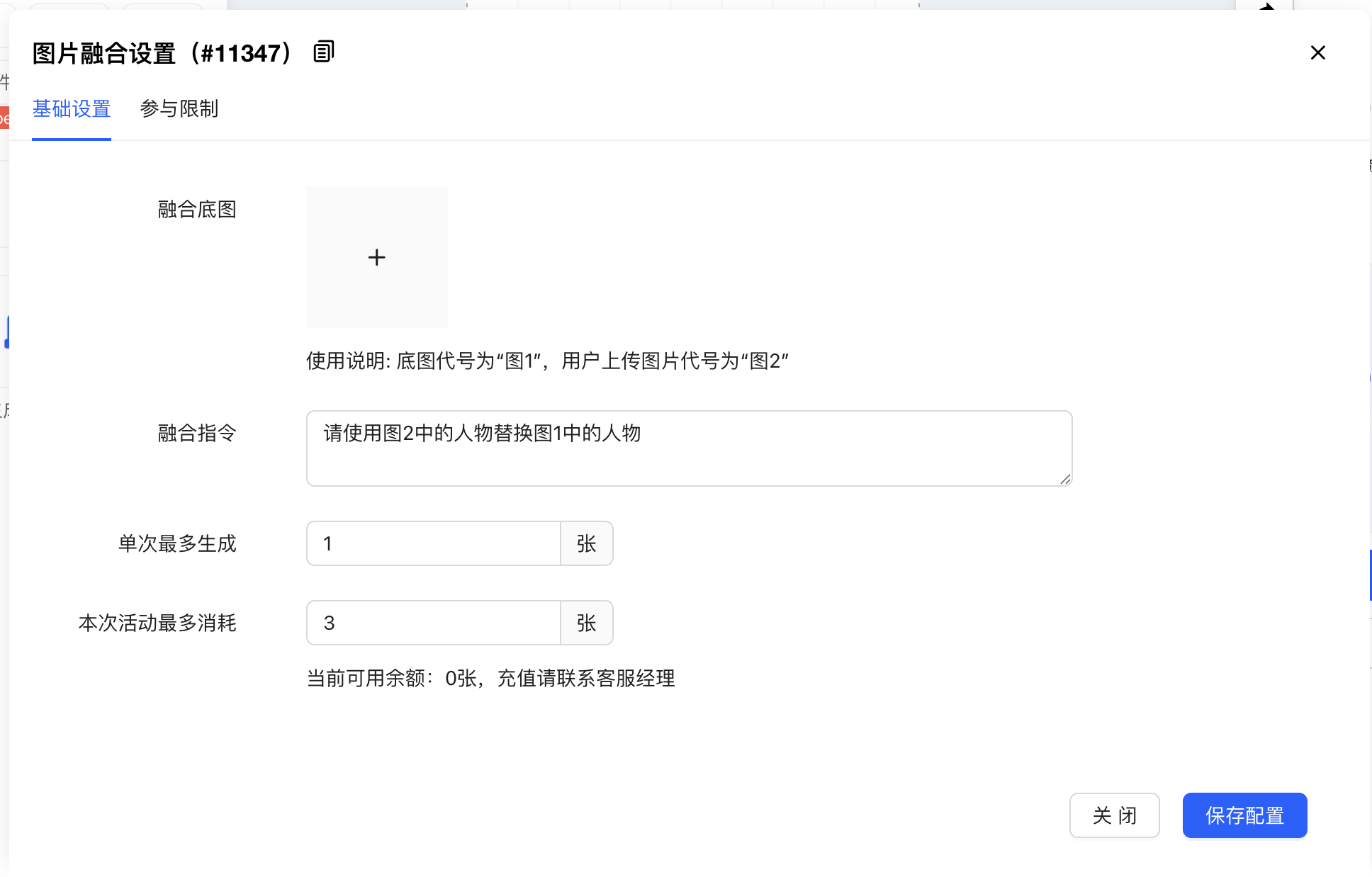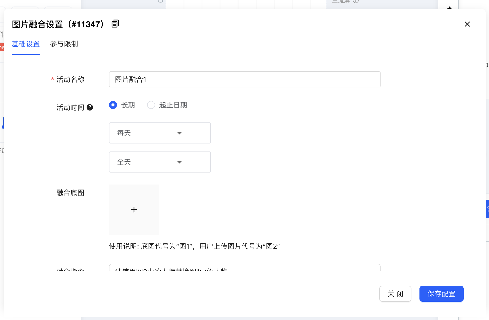 设置活动名称和活动时间,添加融合底图,即想最终变成的目标图片;设置融合指令,默认是请使用图2(即用户上传的图片)替换图1(融合底图)中的人物,客户可以根据自己的需求修改融合指令