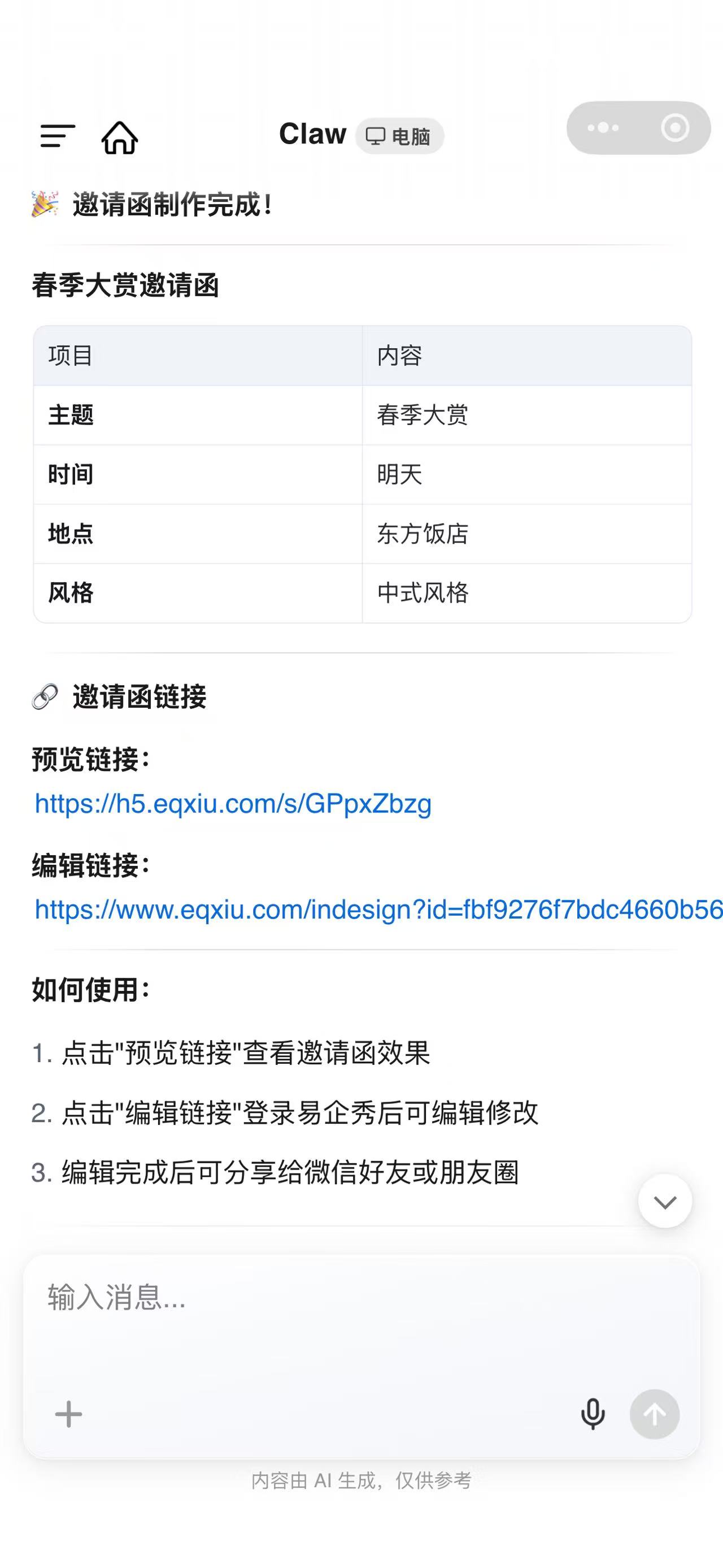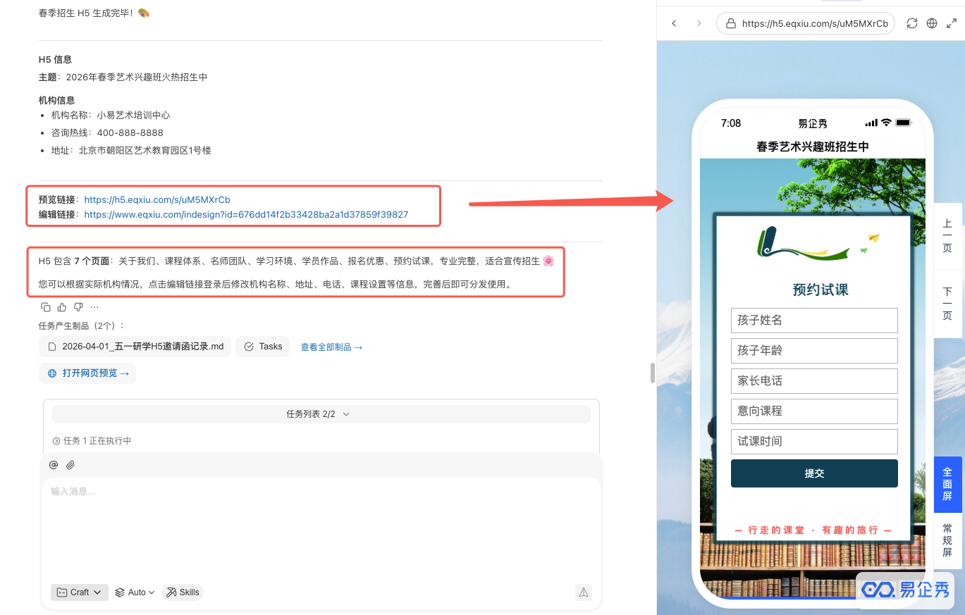 让生成结果更贴合需求的小建议:可以补充风格、目标人群、核心卖点。如果需要收集报名信息,记得说明要带表单。描述越具体,成品通常越接近你想要的效果。