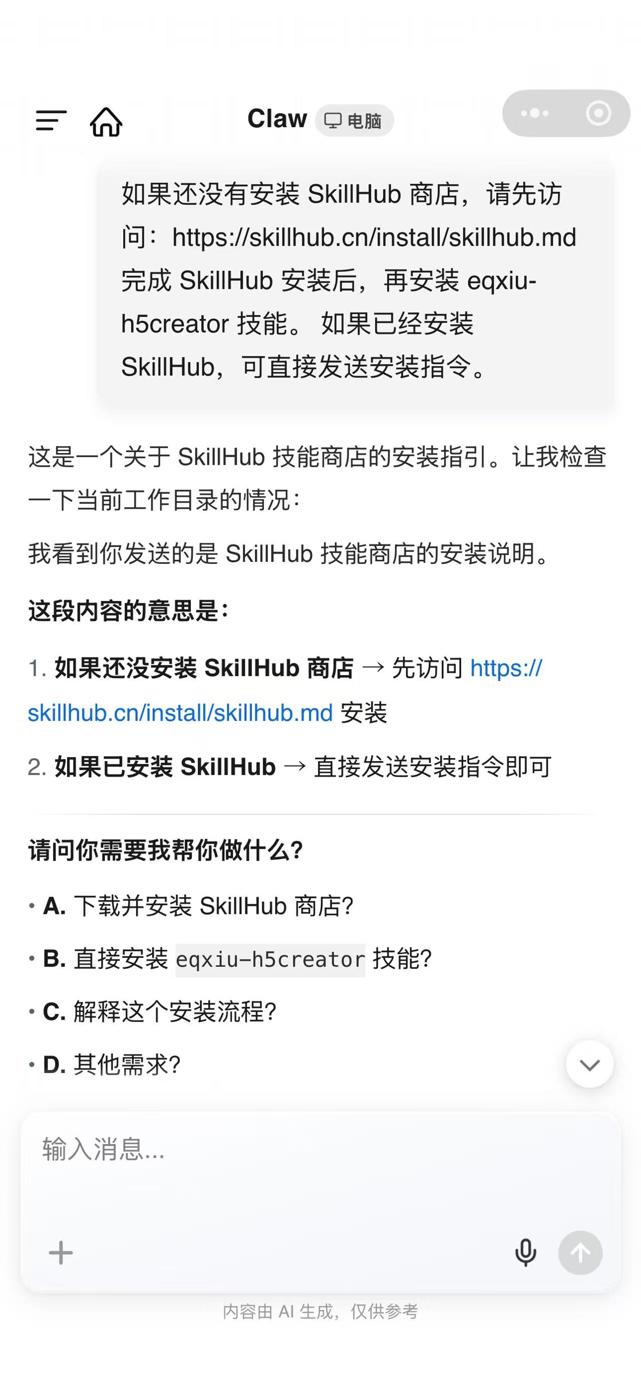 如果还没有安装 SkillHub 商店,请先访问:https://skillhub.cn/install/skillhub.md完成 SkillHub 安装后,再安装 eqxiu-h5creator 技能。如果已经安装 SkillHub,可直接发送安装指令。