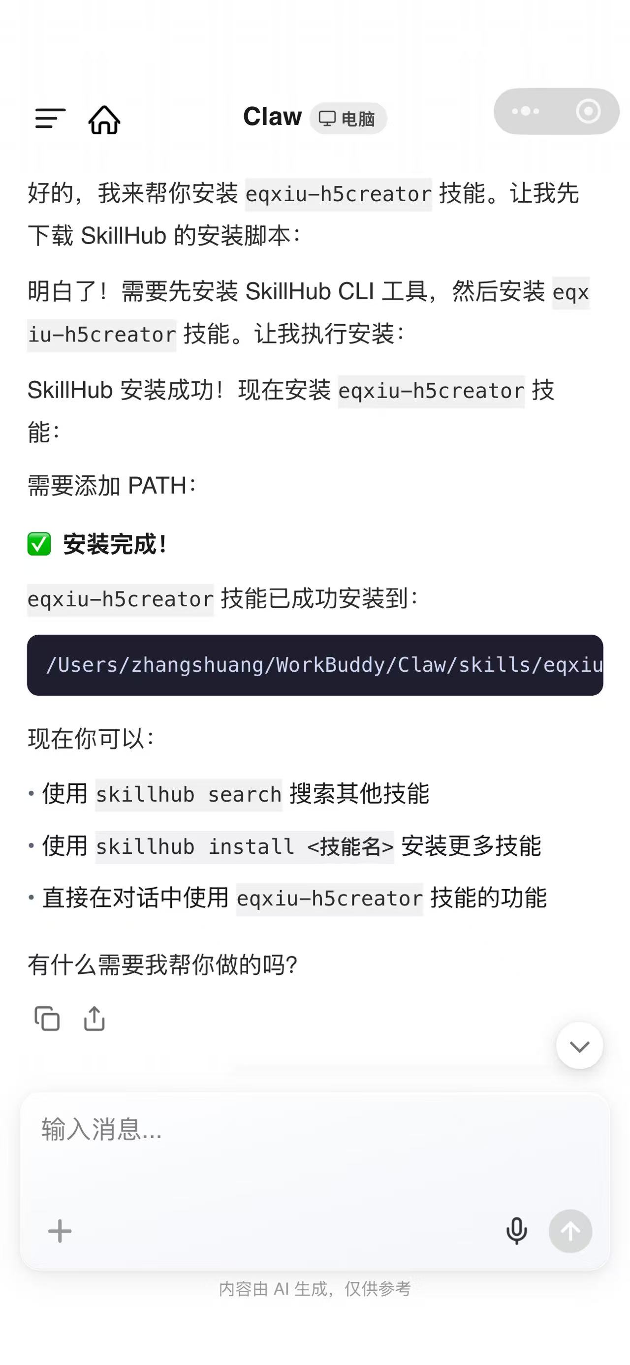 本教程以 WorkBuddy 为例,带你快速完成 H5 Skill 的安装与使用。如果你使用的是其他支持 Skill 的 AI 助手,也可以参考同样的思路操作。