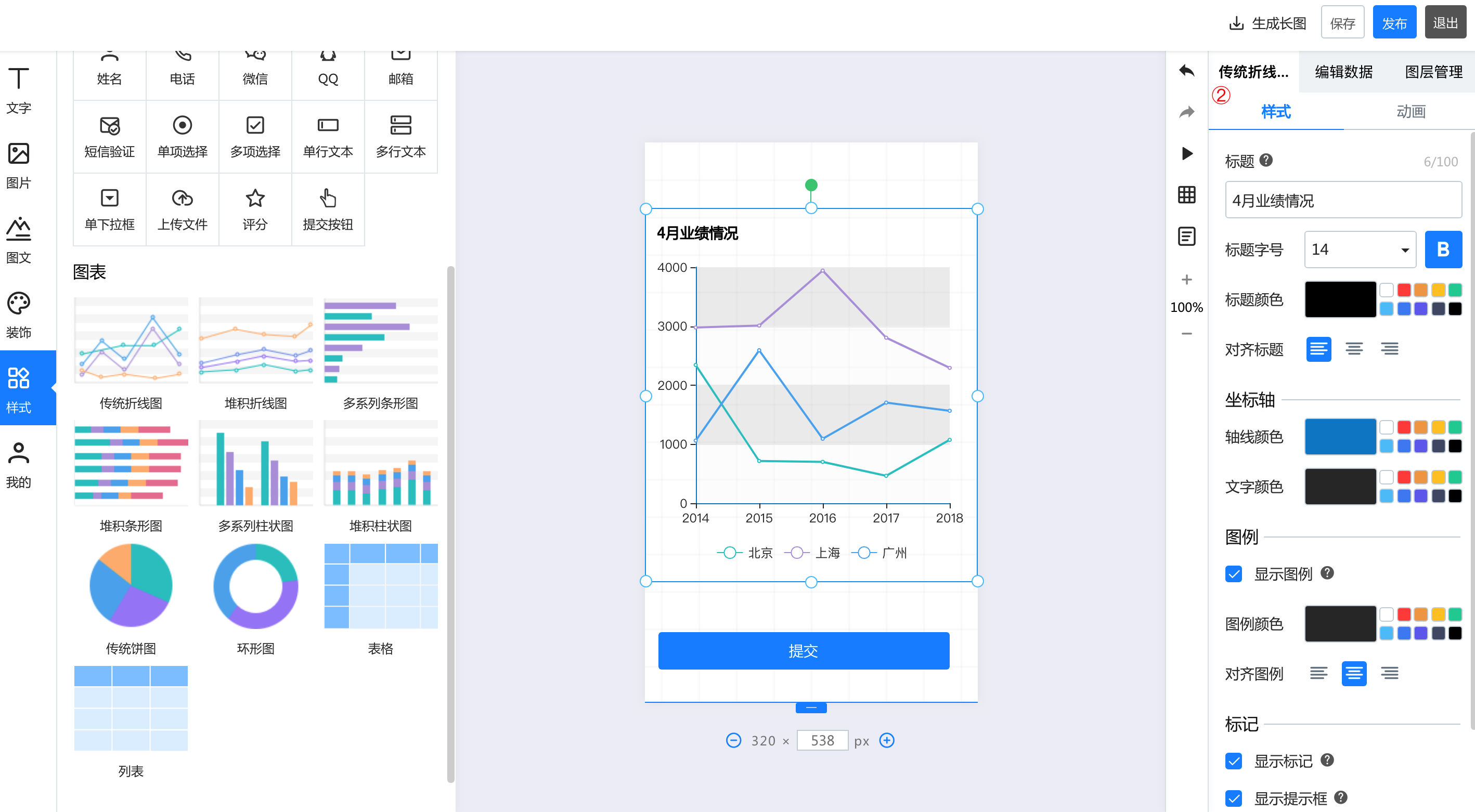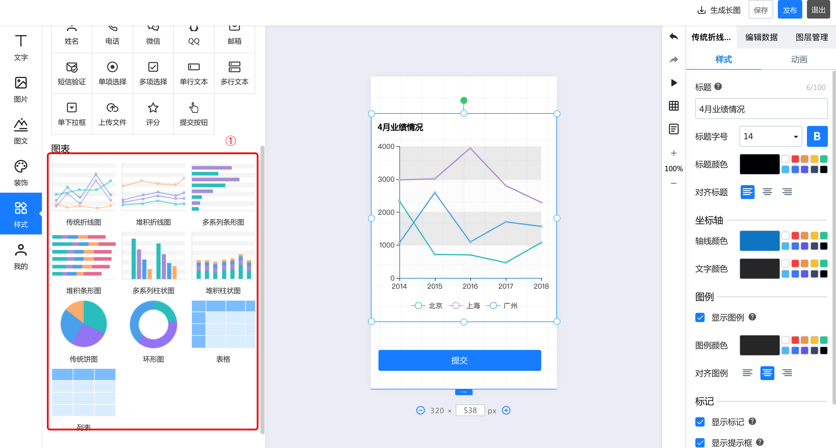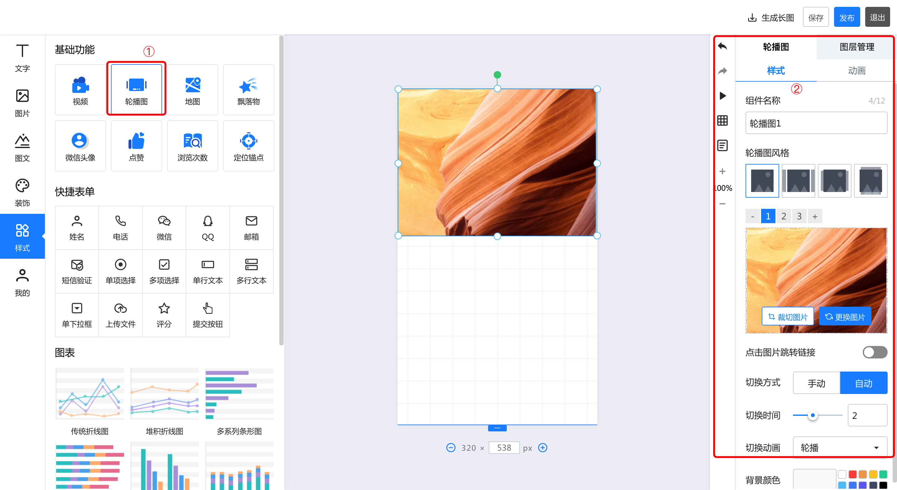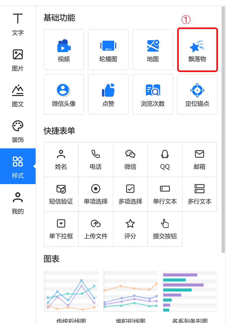 一.基础功能 1.视频 点击视频,上传本地视频,即可在长页中插入视频  2.轮播图 点击轮播图按钮,添加轮播图后,可以在右侧的轮播图中修改样式和动画。其中,有四种轮播风格,支持最多20张图片轮播,可以针对每张图进行裁剪更换和跳转链接设置  3.地图 点击添加地图后,右侧的编辑区可以针对地图样式、名称、地址等进行修改和编辑  4.飘落物 点击飘落物按钮,再右侧选择飘落物样式,即可添加飘落物动效   5.微信头像 点击添加微信头像后,可以在右侧的编辑区修改头像类型、背景颜色等信息  6.点击点赞按钮,在右侧可以选择点赞的图标样式:心、花、点赞、红旗 也可以对图标的颜色、基数等信息进行修改  7.浏览次数 点击浏览次数按钮可添加,在右侧可以针对浏览次数的样式和动画进行修改  8.定位锚点 点击定位锚点后添加,中间编辑区上下拖动锚点来修改锚点的位置,在右侧修改锚点  二、快捷表单 选中左侧的表单元素后添加成功,可以在右侧的编辑区针对名称、默认文本登记本信息以及表单的颜色等基本样式及图层进行修改  三、图表 1.添加图表  2.修改图表样式和动画 可以修改标题的文字及大小和颜色、也可以修改坐标轴及图例的颜色  3.编辑数据 可以直接在线编辑和修改数据,也可以通过导入excel表格导入数据  4.图层管理 如果作品中的元素比较多,可以通过图层管理操作,点击小眼睛隐藏或者展示,点击小锁代表不可编辑或者可编辑状态