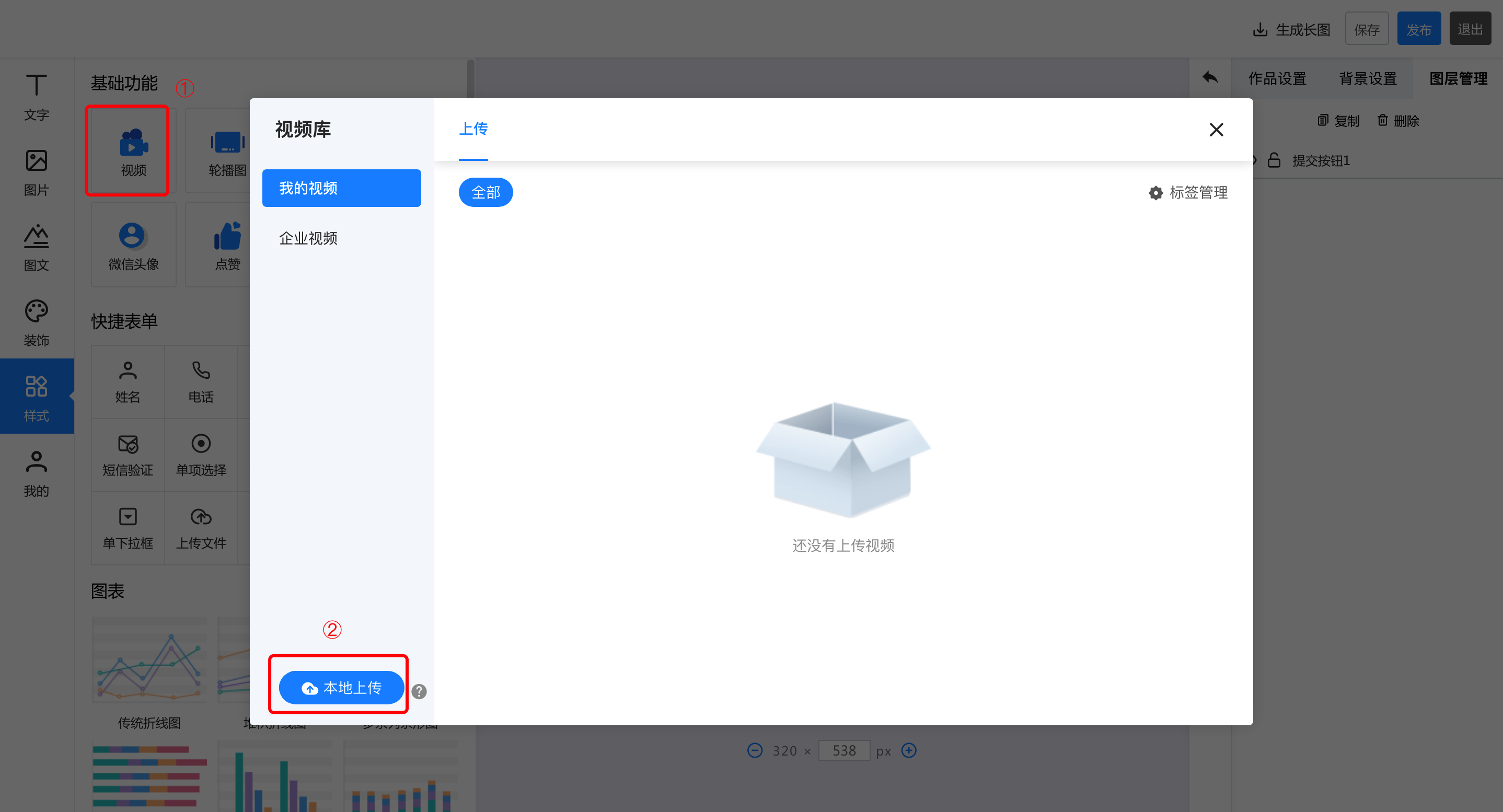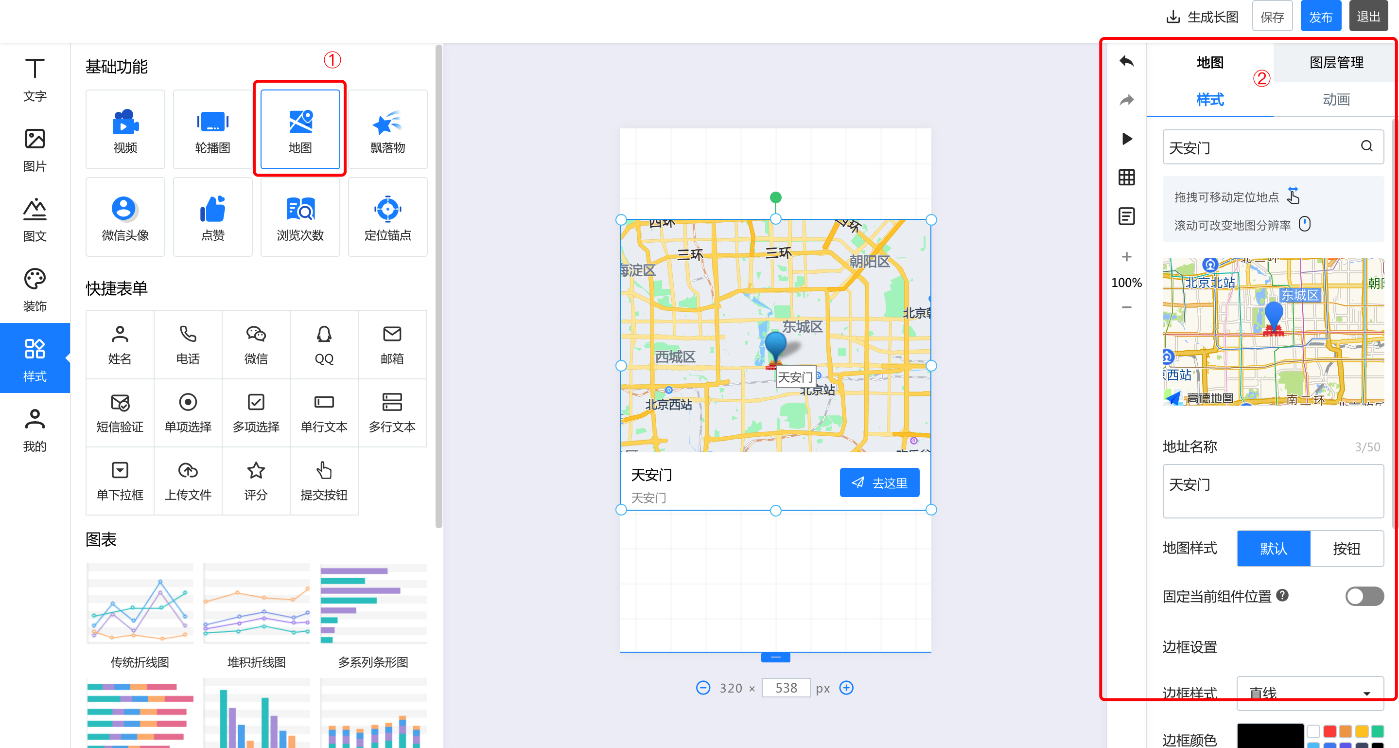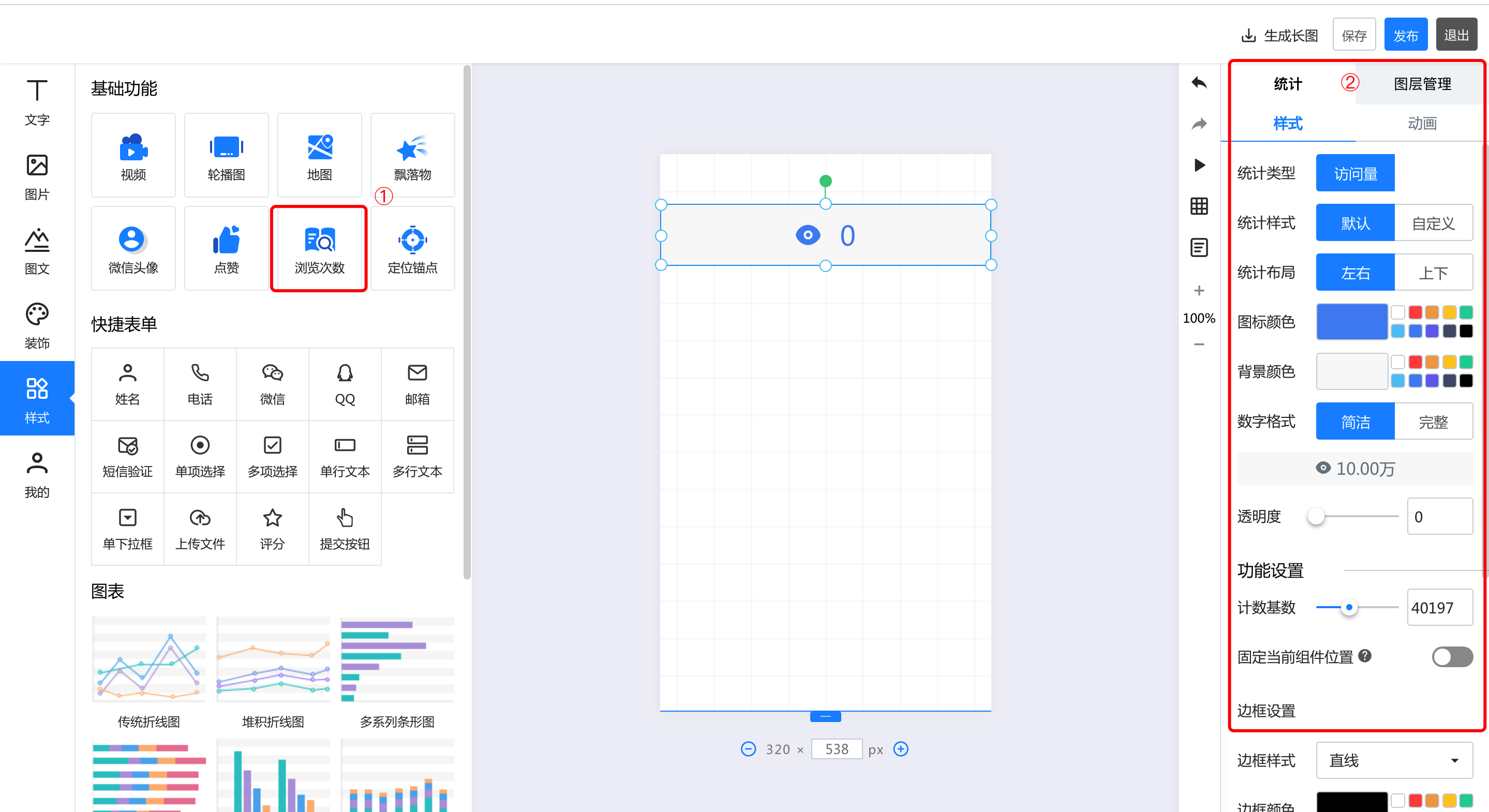 一.基础功能 1.视频 点击视频,上传本地视频,即可在长页中插入视频  2.轮播图 点击轮播图按钮,添加轮播图后,可以在右侧的轮播图中修改样式和动画。其中,有四种轮播风格,支持最多20张图片轮播,可以针对每张图进行裁剪更换和跳转链接设置  3.地图 点击添加地图后,右侧的编辑区可以针对地图样式、名称、地址等进行修改和编辑  4.飘落物 点击飘落物按钮,再右侧选择飘落物样式,即可添加飘落物动效   5.微信头像 点击添加微信头像后,可以在右侧的编辑区修改头像类型、背景颜色等信息  6.点击点赞按钮,在右侧可以选择点赞的图标样式:心、花、点赞、红旗 也可以对图标的颜色、基数等信息进行修改  7.浏览次数 点击浏览次数按钮可添加,在右侧可以针对浏览次数的样式和动画进行修改  8.定位锚点 点击定位锚点后添加,中间编辑区上下拖动锚点来修改锚点的位置,在右侧修改锚点  二、快捷表单 选中左侧的表单元素后添加成功,可以在右侧的编辑区针对名称、默认文本登记本信息以及表单的颜色等基本样式及图层进行修改  三、图表 1.添加图表  2.修改图表样式和动画 可以修改标题的文字及大小和颜色、也可以修改坐标轴及图例的颜色  3.编辑数据 可以直接在线编辑和修改数据,也可以通过导入excel表格导入数据  4.图层管理 如果作品中的元素比较多,可以通过图层管理操作,点击小眼睛隐藏或者展示,点击小锁代表不可编辑或者可编辑状态