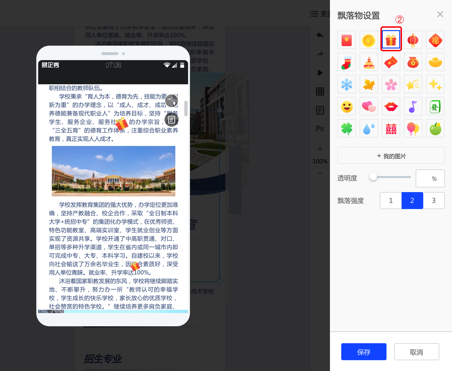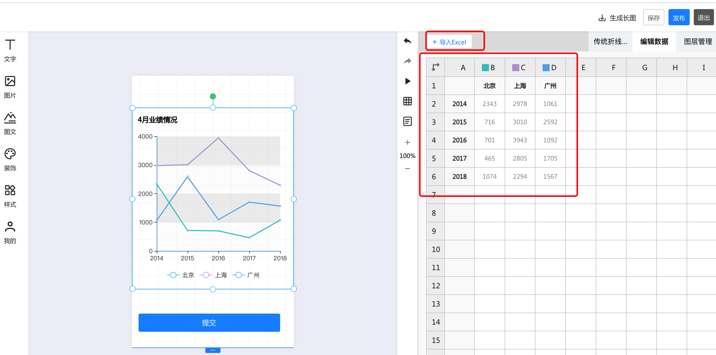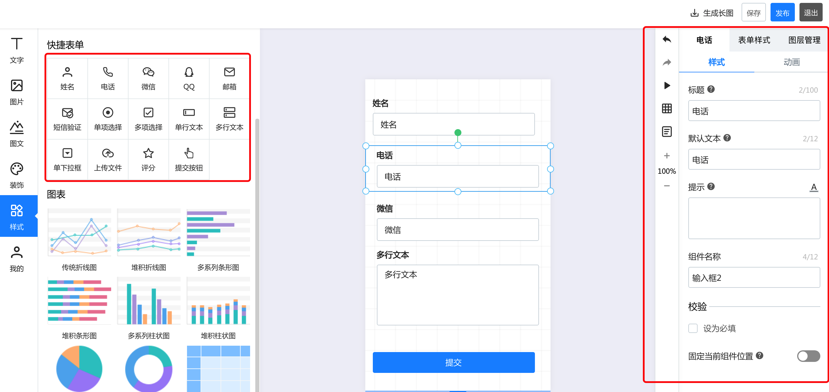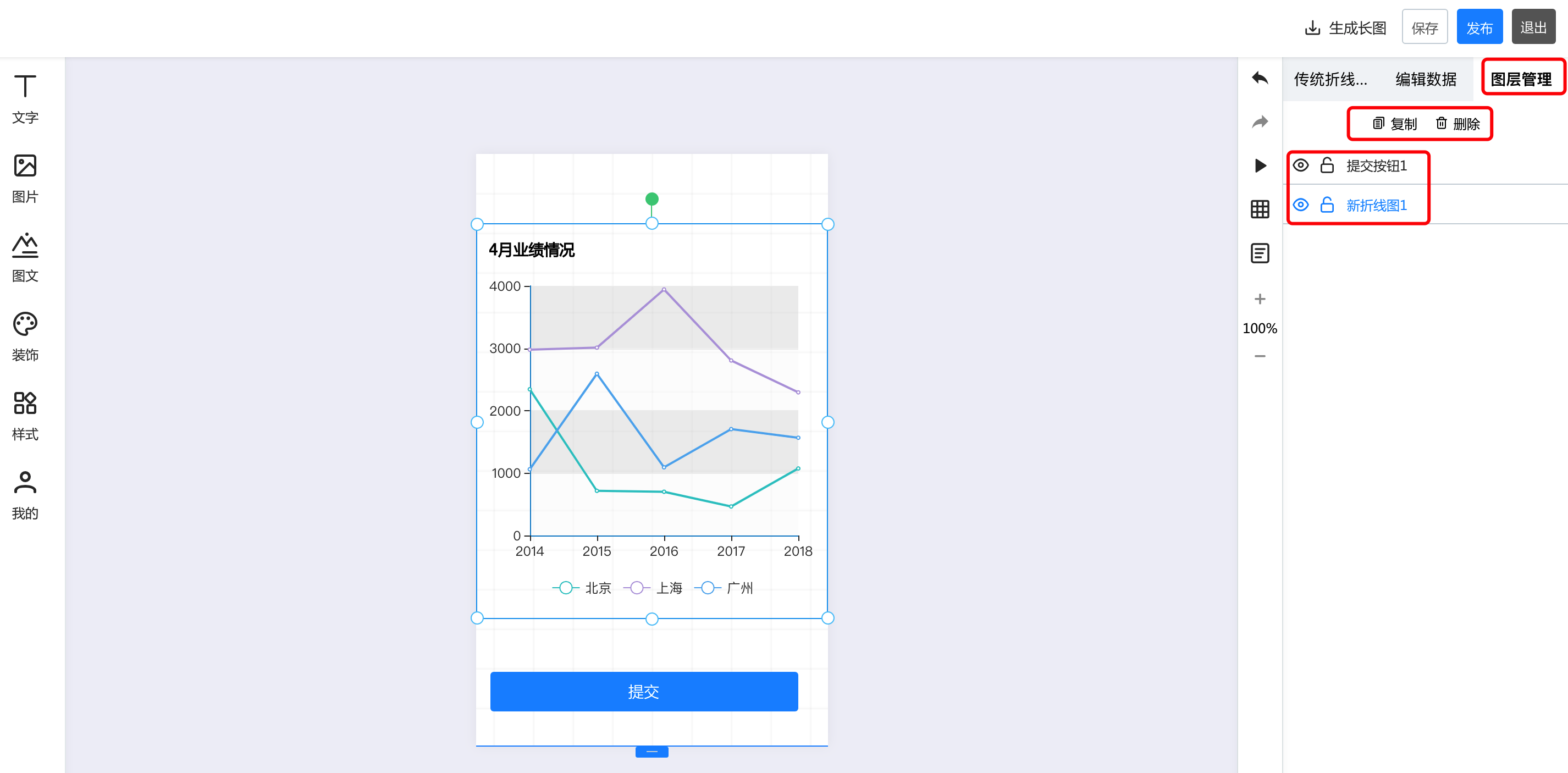 一.基础功能 1.视频 点击视频,上传本地视频,即可在长页中插入视频  2.轮播图 点击轮播图按钮,添加轮播图后,可以在右侧的轮播图中修改样式和动画。其中,有四种轮播风格,支持最多20张图片轮播,可以针对每张图进行裁剪更换和跳转链接设置  3.地图 点击添加地图后,右侧的编辑区可以针对地图样式、名称、地址等进行修改和编辑  4.飘落物 点击飘落物按钮,再右侧选择飘落物样式,即可添加飘落物动效   5.微信头像 点击添加微信头像后,可以在右侧的编辑区修改头像类型、背景颜色等信息  6.点击点赞按钮,在右侧可以选择点赞的图标样式:心、花、点赞、红旗 也可以对图标的颜色、基数等信息进行修改  7.浏览次数 点击浏览次数按钮可添加,在右侧可以针对浏览次数的样式和动画进行修改  8.定位锚点 点击定位锚点后添加,中间编辑区上下拖动锚点来修改锚点的位置,在右侧修改锚点  二、快捷表单 选中左侧的表单元素后添加成功,可以在右侧的编辑区针对名称、默认文本登记本信息以及表单的颜色等基本样式及图层进行修改  三、图表 1.添加图表  2.修改图表样式和动画 可以修改标题的文字及大小和颜色、也可以修改坐标轴及图例的颜色  3.编辑数据 可以直接在线编辑和修改数据,也可以通过导入excel表格导入数据  4.图层管理 如果作品中的元素比较多,可以通过图层管理操作,点击小眼睛隐藏或者展示,点击小锁代表不可编辑或者可编辑状态