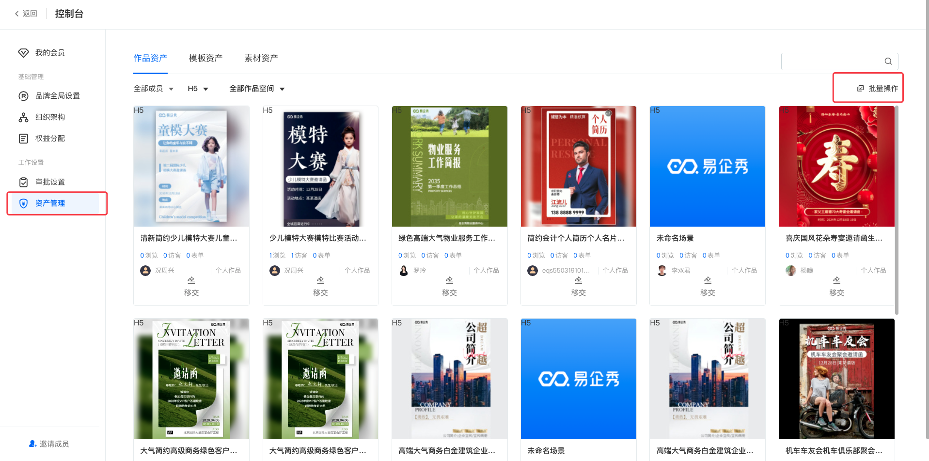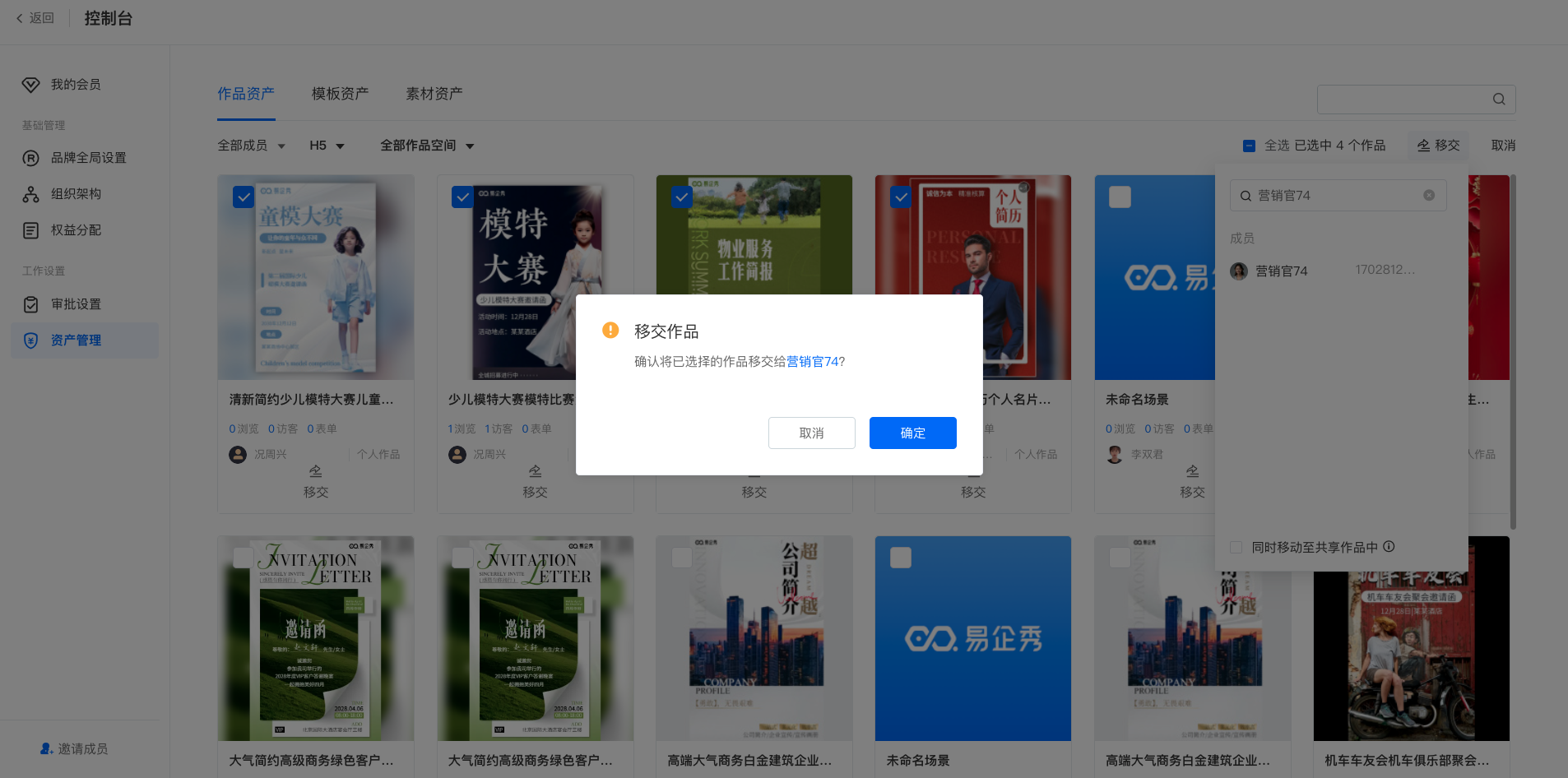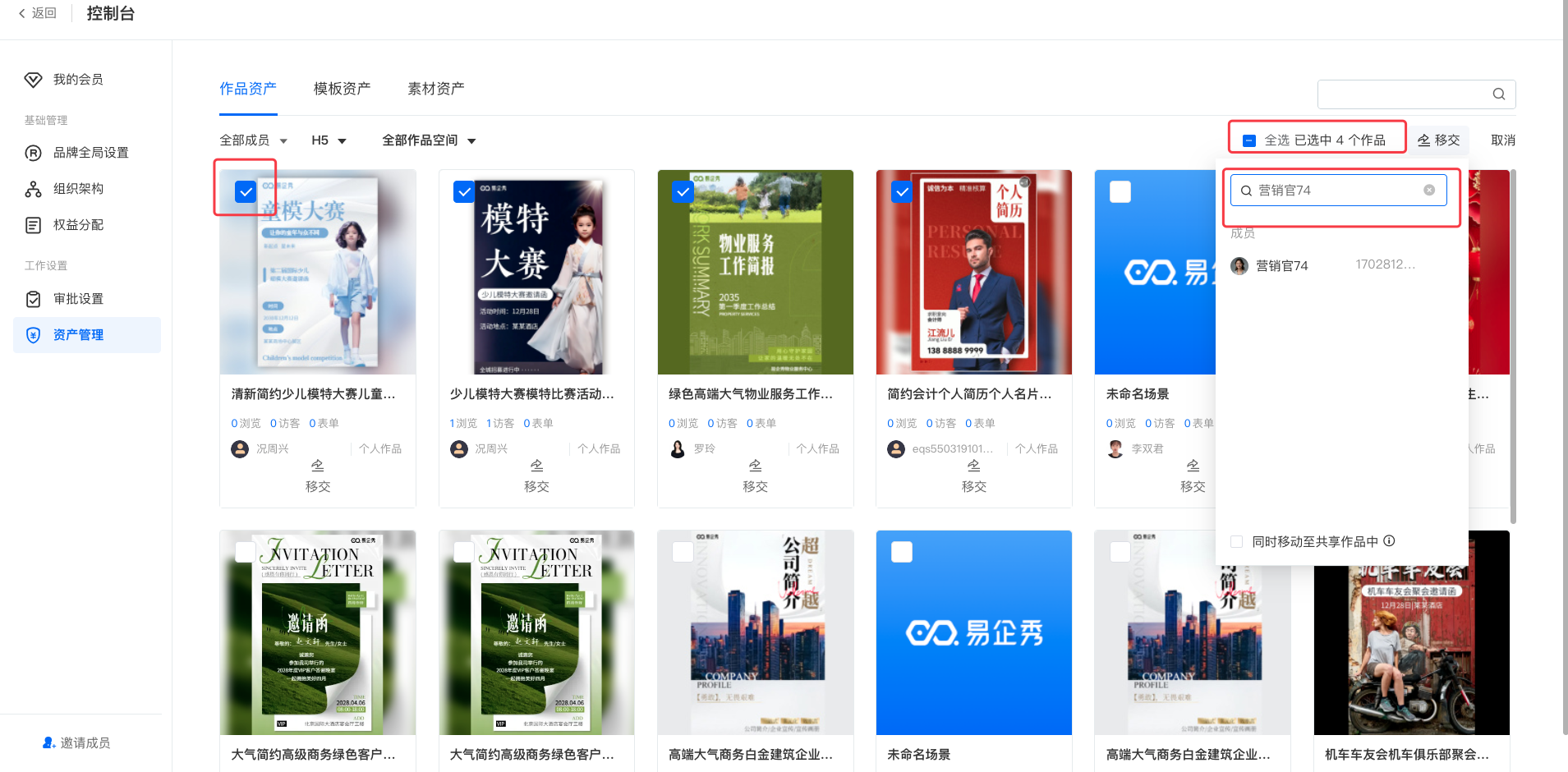 登陆控制台-资产管理-筛选成员作品/作品类型-批量操作-全选-移交-选择接收人-确认移交,