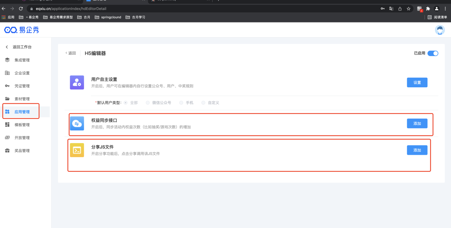 > 用于实现“任务”玩法,支持拉新、促活 <span style="color: red">**建议使用新版任务组件:**[《任务组件(新)》](https://hc.eqxiu.cn/doc/3035/ "任务组件(新)")</span> # 任务组件说明 - 系统任务:任务的完成、领取都是易企秀控制,系统任务的操作类型有 - 浏览页面:访客点击任务按钮,会进行浏览指定页面,页面跳转,任务即为完成 - 分享:访客点击按钮,调用指定js的方法,js回调successFn函数,任务完成 - 登录:访客浏览当前活动页面,任务即为完成 - 自定义任务:任务的完成是由制作者通过接口通知控制,任务的操作类型有 - 浏览页面:访客点击任务按钮,会进行浏览指定页面,页面跳转 - 分享:访客点击按钮,调用指定js的方法 - 无:点击无任何动作 - 刷新周期:指定任务有效期,分为每年以及自定义 - 每天:每天任务重新计算,假如用户完成当日任务,未领取,第二天需要重新完成任务 - 每周:按照当前所在周进行起止 有效期任务计算 - 每月:按照当前所在月进行起止 有效期任务计算 - 自定义:用户指定周期开始时间以及间隔。 | **属性名称** | **属性说明** | | --- | --- | | 任务名称 | 制作者定义,用于在任务统计中显示,不对外 | | 任务Id | 客户自定义任务标识,用来在自定义任务,接收通知,控制任务完成 | | 完成奖励 | 任务完成时,用户领取到奖励,默认为当前活动的奖励增加次数 | | 权益同步接口 | 任务领取时,服务端会以接口通知形式调用该接口,通知XX用户,领取了XX奖励 | | 按钮设置 | 设置按钮在三种状态下的文案、颜色等属性 | # 操作说明 ## 新建h5作品 为了更适合适配多任务,建议,删除默认页面,新建长页面  选取任务组件,调整布局,例如:  ## 编写分享js 参考内容格式如下: ``` var src = document.currentScript.src; var param = getUrlParam('jsFile',src) window[param] = function testJs(baseParams,taskParams,sucessFn,errorFn) { console.log( baseParams,taskParams,'调起外部js') if (typeof sucessFn == "function") {sucessFn()} } function parseUrl(url) { if (url.startsWith('//')) { url = location.protocol + url; } return new window.URL(url); } function getUrlParam(name, url) { return parseUrl(url).searchParams.get(name); } ``` 说明:在分享任务按钮点击去完成时,会调用具体的js,会执行testJs方法,该方法名称可以随意指定。具体参数有如下: baseParams:基础参数,有用户授权信息。具体参数如下 encodeId:易企秀访客标识 thirdUserId:自定义授权用户标识 openId:公众号微信授权标识 mobile:手机号授权时手机号 taskParams:任务参数,分享任务的参数如下: shareUrl: 任务中配置的分享url shareTitle: 任务中配置的分享链接标题, shareDesc: 任务中配置的分享链接描述, shareImg: 任务中配置的分享链接封面, sucessFn:成功回调函数,用户通知任务完成 errorFn:失败回调函数,暂时无用 ## 配置对应js路径 1、企业自己配置,需要提供者解决跨域问题 2、交由易企秀技术负责同事,放到内容中台对象储存上,同一个js默认不存在跨域问题 通过上述两种方式得到对应的js路径,通过【应用管理】-【H5编辑器】配置,具体如下:  # 相关接口 ## 自定义任务完成 - 接口描述:自定义任务完成,如果任务未勾选【已完成】则状态直接变为【已领取】 - 请求方式:GET - 数据格式:/api/v1/preview/comp/task/customer/outSideFinish?mixCreationId=&creationId=&thirdUserId=&outTaskCode=&token=TOKEN - 接口入参 | 参数名 | 必须 | 参数类型 | 参数说明 | | --- | --- | --- | --- | | mixCreationId | 是 | Long | 活动ID。互动作品的ID 【互动作品ID】 | | creationId | 是 | Long | 被嵌入作品ID,【h5作品ID】 | | thirdUserId | 是 | String | 自定义用户,用户标示 | | outTaskCode | 是 | String | 任务组件中填写的任务ID | | token | 是 | String | 服务端交互凭据token | ```json { "success": true, "code": 200, "msg": "操作成功", "obj": { "id": 779, "taskId": 143, "encodeId": "846674cdca7e20d878b15b837e554f92", "nickName": "testTry3901", "mixCreationId": 21771, "creationId": 21763, "elementId": 7755128463, "name": "任务组件id", "intervalType": 1, "status": 2, "rewardSyncUrl": "http://23c3-118-122-120-59.ngrok.io/test", "rewardType": 1, "rewardValue": 1, "rewardSyncStatus": null, "rewardSyncResponse": null, "finishDate": "2022-01-10 16:30:43", "rewardDate": null, "taskStartDate": "2022-01-10 00:00:00", "taskEndDate": "2022-01-11 00:00:00" }, "map": null, "list": null } ``` - 接口出参 | 参数名 | 必须 | 参数类型 | 参数说明 | | --- | --- | --- | --- | | success | 必填 | boolean | 请求状态 | | code | 必填 | int | 请求状态码,200成功, | | obj | 必须 | object | 任务信息 | 示例 ```json { "success": true, "code": "200", "msg": null, "obj": null, "map": null, "list": [] } ``` ## 自定义任务重置 - 接口描述:自定义任务重置,将任务中台置为【未开始】 - 请求方式:GET - 数据格式:/api/v1/preview/comp/task/customer/outSideReset?mixCreationId=&creationId=&thirdUserId=&outTaskCode=&token=TOKEN - 接口入参 | 参数名 | 必须 | 参数类型 | 参数说明 | | --- | --- | --- | --- | | mixCreationId | 是 | Long | 活动ID。互动作品的ID 【互动作品ID】 | | creationId | 是 | Long | 被嵌入作品ID,【h5作品ID】 | | thirdUserId | 是 | String | 自定义用户,用户标示 | | outTaskCode | 是 | String | 任务组件中填写的任务ID | | token | 是 | String | 服务端交互凭据token | ```json { "success": true, "code": 200, "msg": "操作成功", "obj": null, "map": null, "list": null } ``` - 接口出参 | 参数名 | 必须 | 参数类型 | 参数说明 | | --- | --- | --- | --- | | success | 必填 | boolean | 请求状态 | | code | 必填 | int | 请求状态码,200成