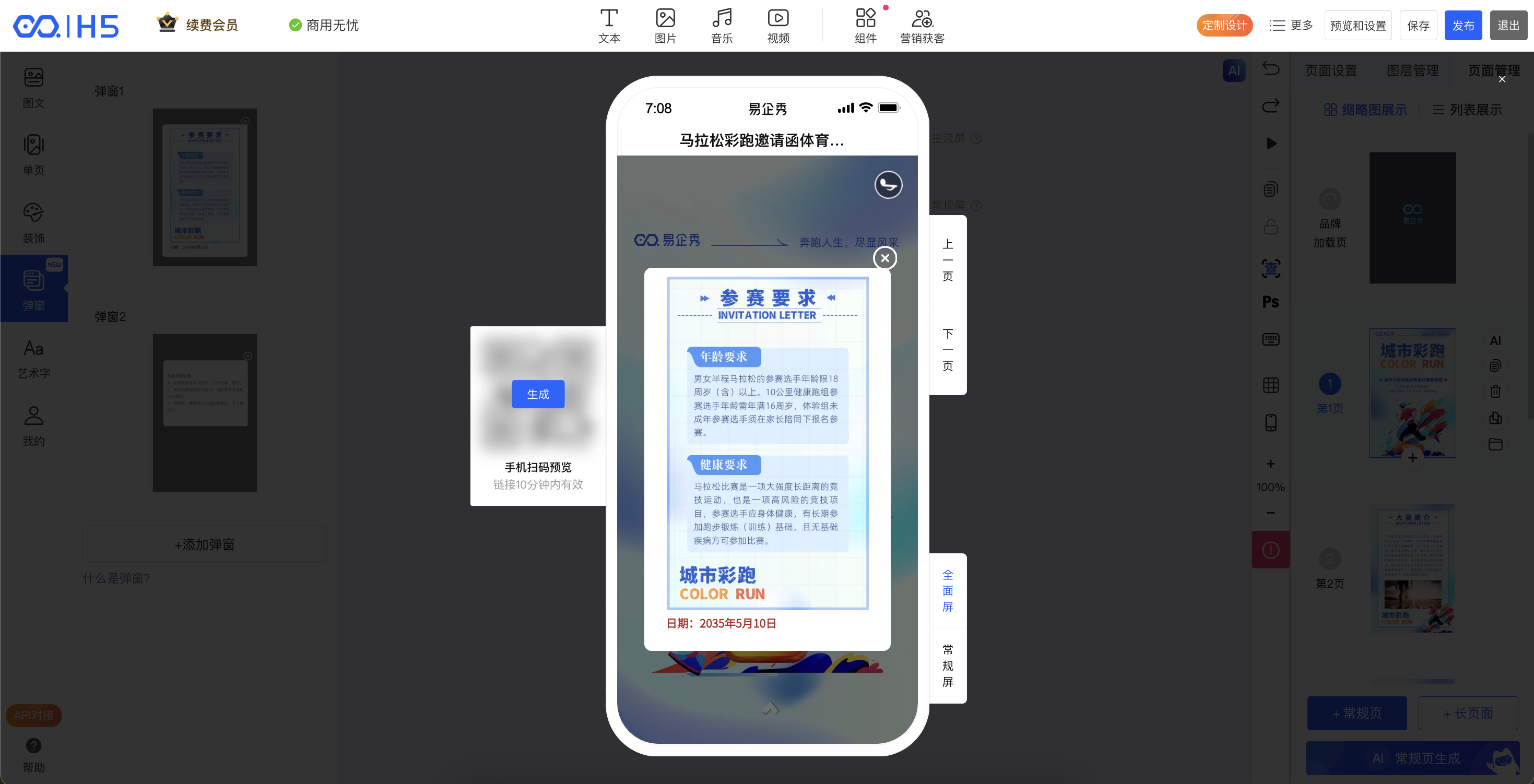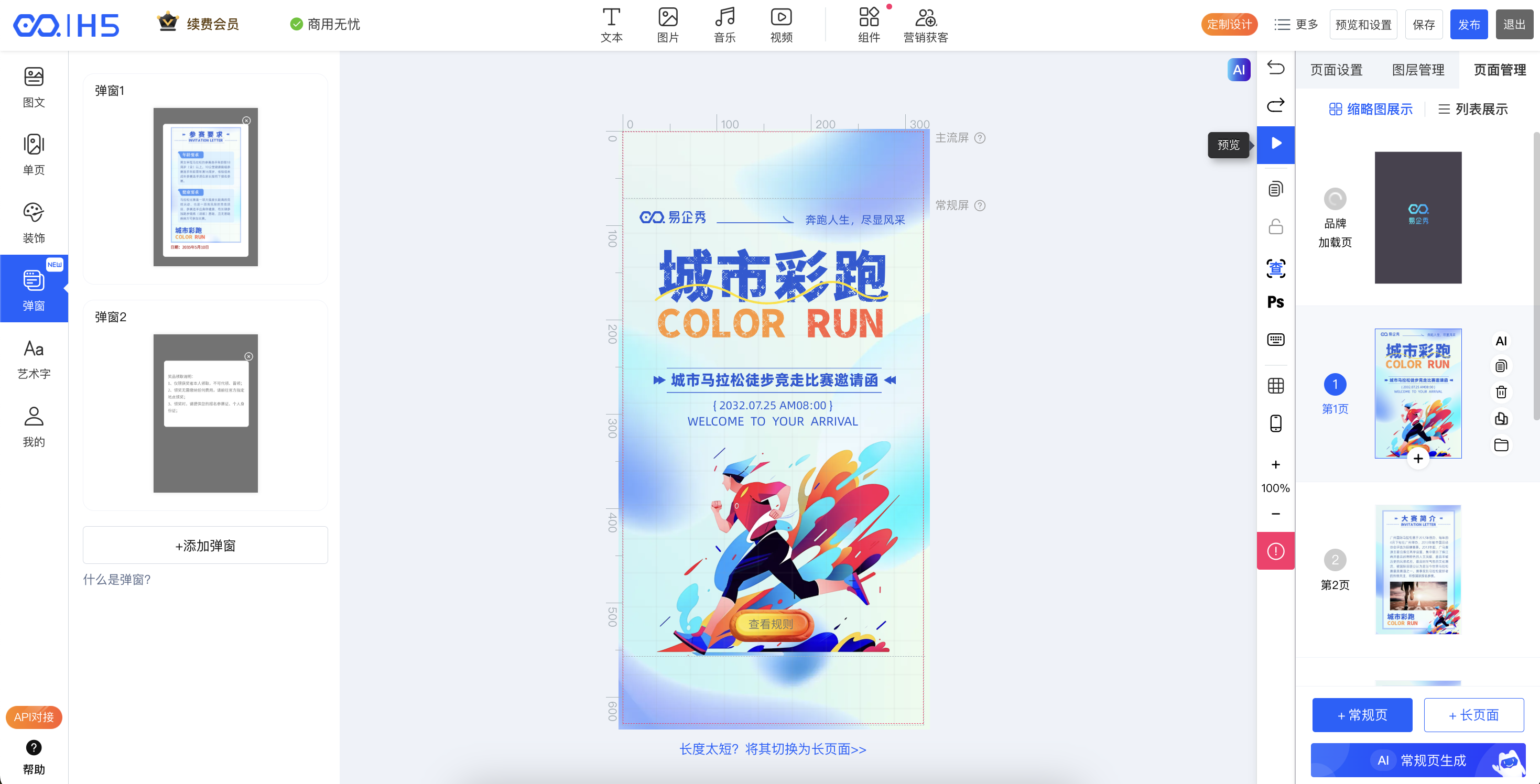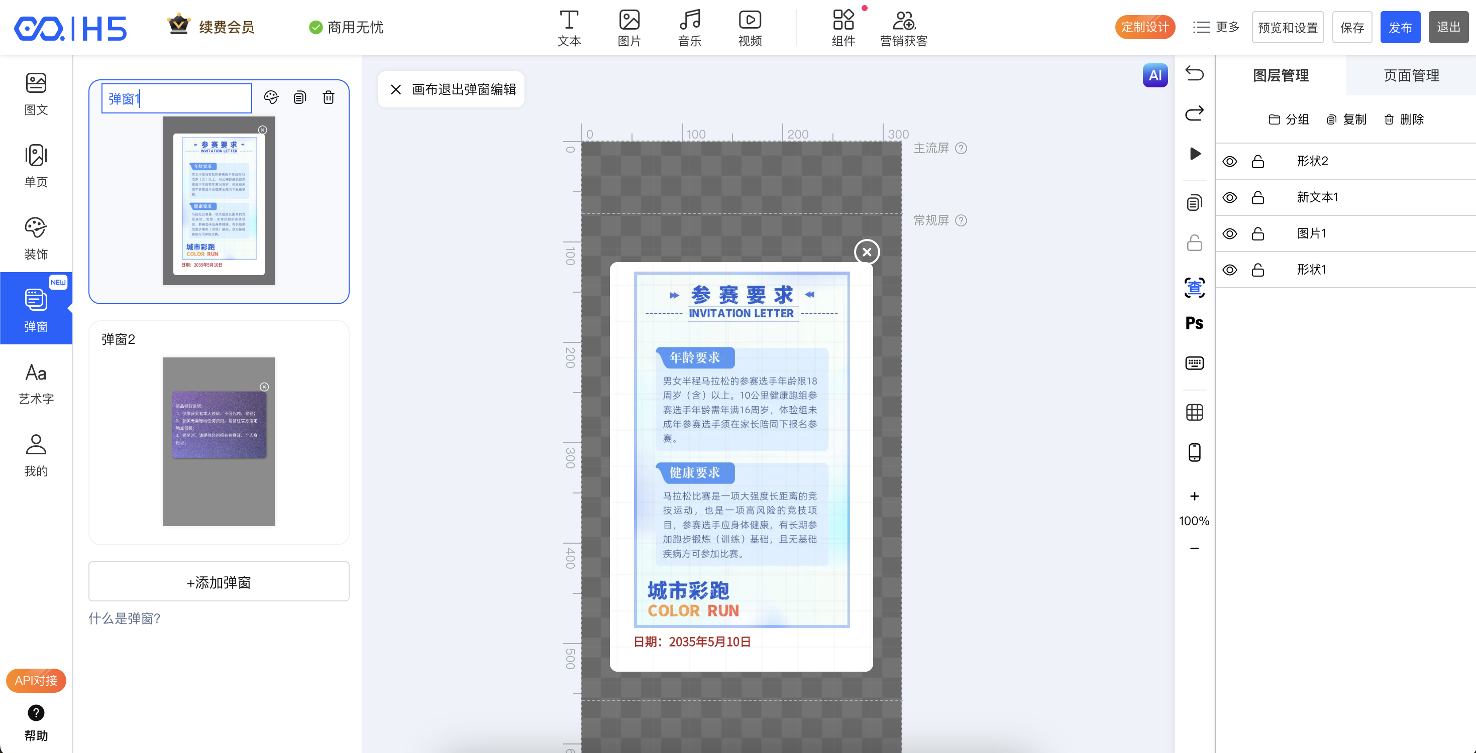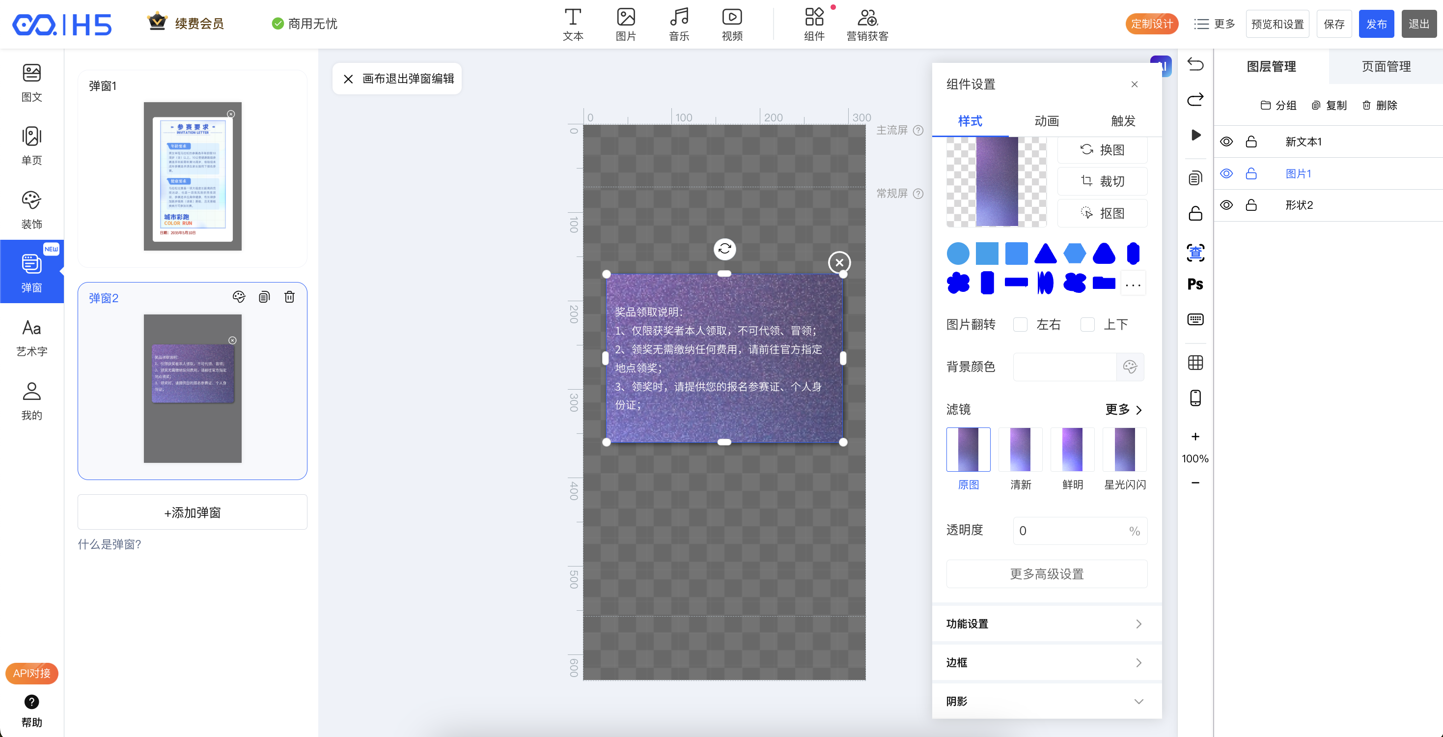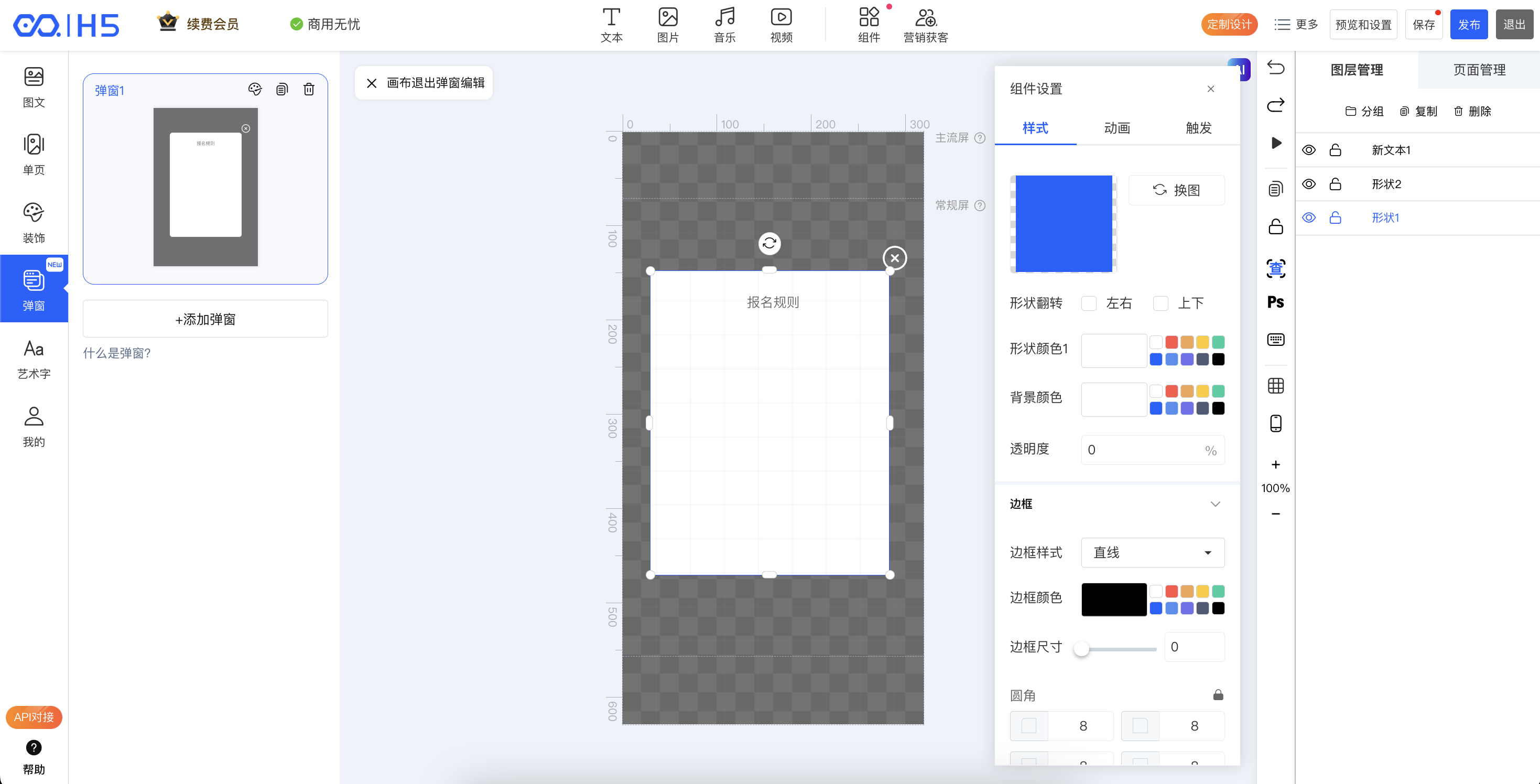 可以在弹窗上任意添加文字及图片,白底弹窗本身也可任意换成其它图片;可以任意拖动改变弹窗的大小,并设置圆角、阴影等;根据H5中各个页面的需要,可以添加多个弹窗,供不同页面调取使用。